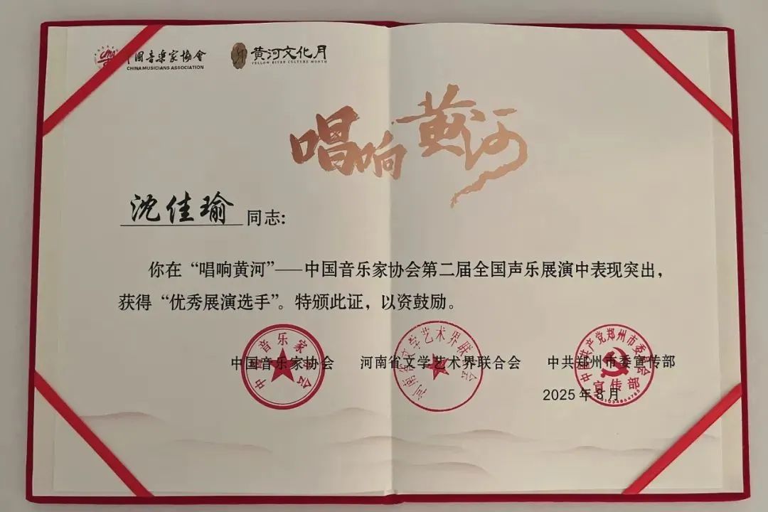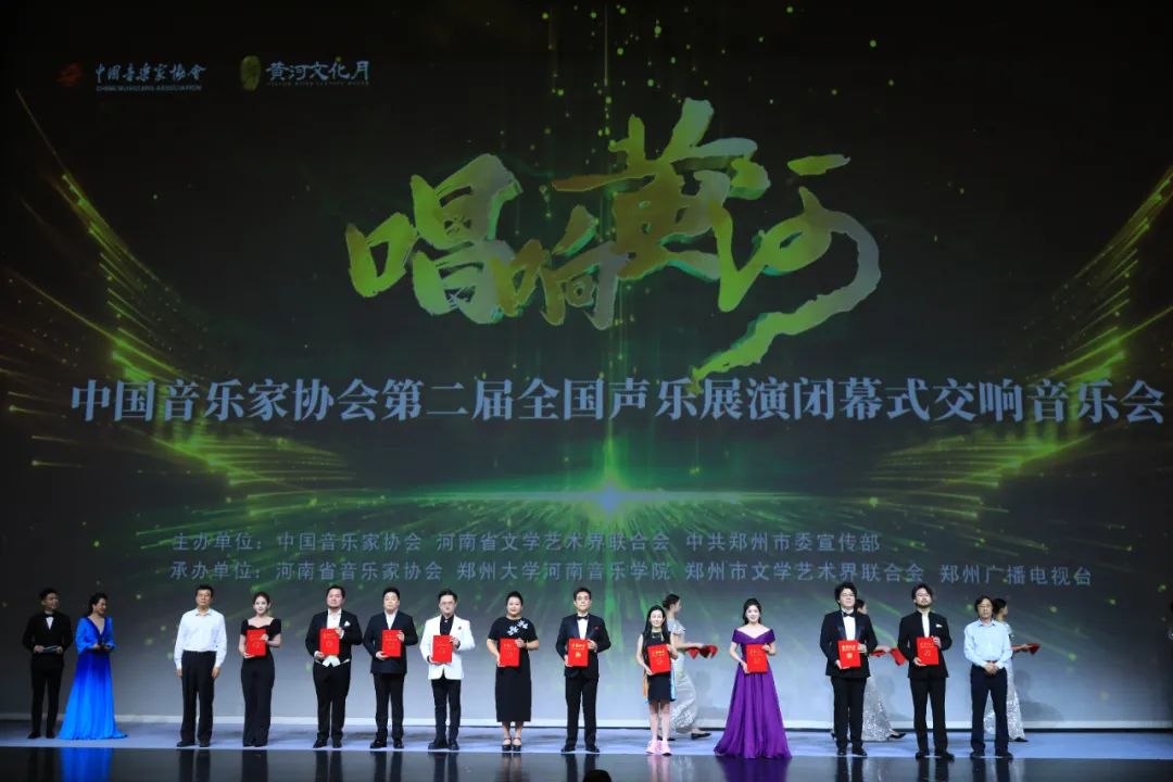 作者:田震坤 来源:声乐歌剧系 发布时间:2025-08-198月10日至15日,“唱响黄河”——中国音乐家协会第二届全国声乐展演在郑州举行。我校声乐歌剧系青年教师沈佳瑜(美声方向,艺术指导:肖洋),硕士研究生周先扬(民声方向,指导教师:解本康,艺术指导:肖洋)参加,其中沈佳瑜获得“优秀展演选手”称号,并受邀参演闭幕式音乐会。