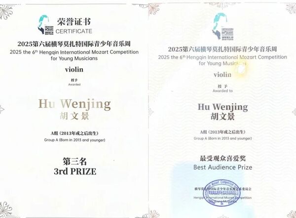 近日,2025第六届横琴莫扎特国际青少年音乐周落下帷幕,浙江音乐学院室内乐学院少年班学员胡文景(Wenjing Hu)凭借出色的表现,荣获小提琴A组(2013年及以后出生)第三名和最受观众喜爱奖。这是他继2023年柯岗国际小提琴比赛三等奖、2024年比利时格鲁米奥国际小提琴比赛第二名之后,再次在国际舞台上获得优秀成绩。这一成绩也充分展现了室内乐学院在青少年音乐人才培养方面的系统化教学成果。
