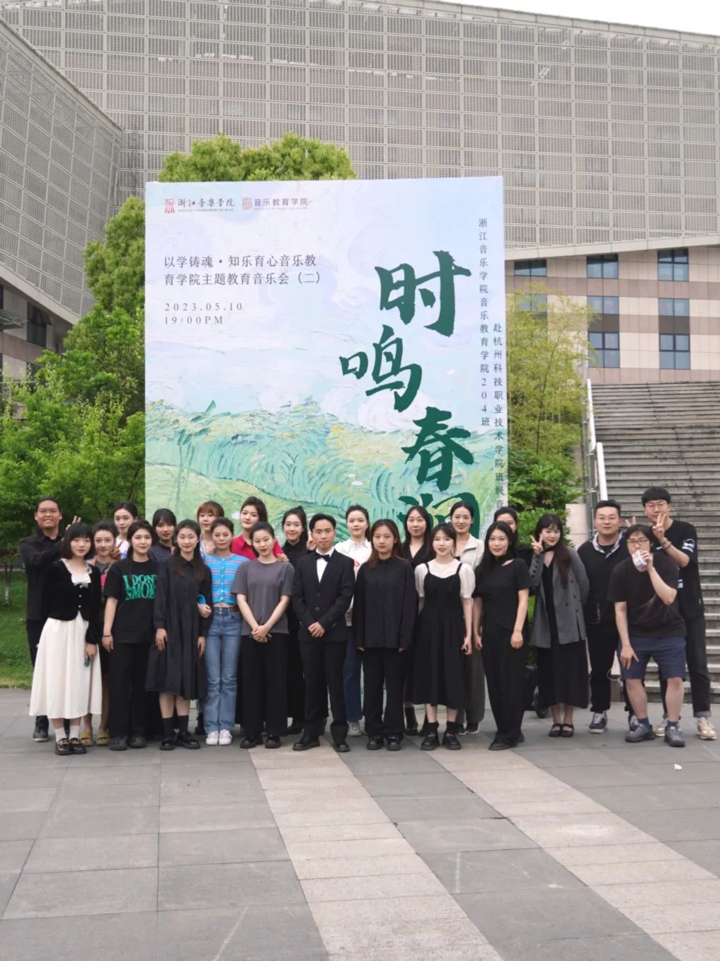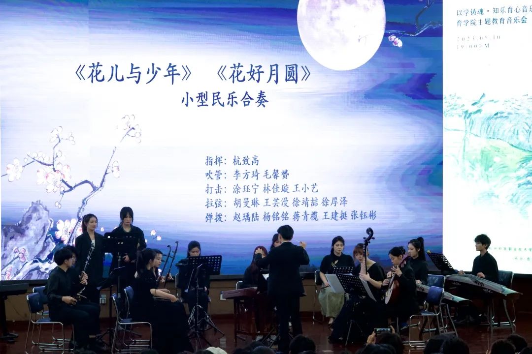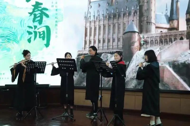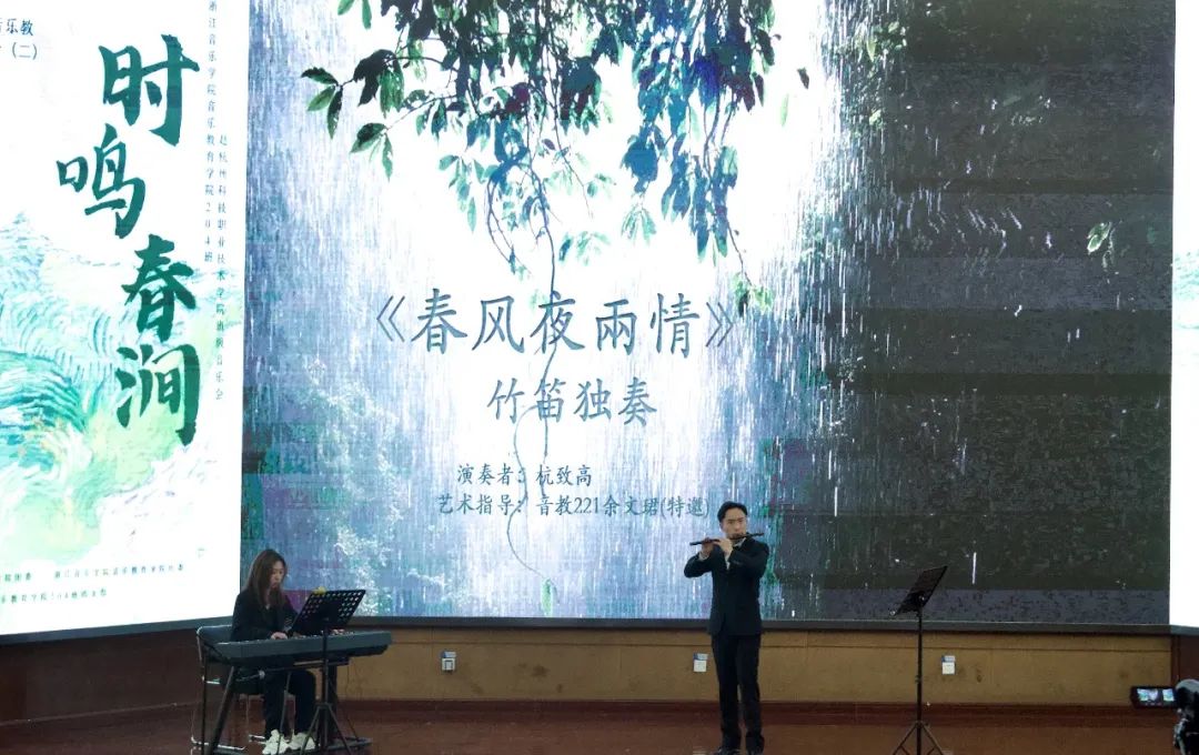 音乐教育学院组织班级赴杭州科技职业技术学院开展文艺宣讲音乐会 为深入推进学习贯彻习近平新时代中国特色社会主义思想主题教育,音乐教育学院组织音教204班的同学们走出学校,走进杭州科技职业技术学院开展了一场推动高雅艺术进校园、弘扬民族文化的学习实践活动。  全体同学在音教学院团委书记、学工办主任张冉冉老师、班主任林静老师及全体辅导员的带领下来到杭州科技职业技术学院,开展了一场别开生面的艺术宣讲班级音乐会。两校的同学们一起用琴声展现自我,描绘时代青春;用舞蹈传递力量,焕发青年活力。 一、重奏    长笛重奏曲《沃尔塔瓦河》等以丰富的表现力与优美的音乐而广为流传。无论是结构还是音乐上都通俗易懂,曲调明快、欢乐,是人们幸福生活、开朗情绪的写照,展现了神话般的幻想、大自然的神秘色彩和诗情画意。   弦乐四重奏和管弦重奏的两首作品演奏,让观众们陶醉其中,带来视听上的一种别样的感受。  古筝的灵动与弹性,代替了钢琴丰富多彩的和弦铺垫与打击乐复杂多变的节奏,使《动感弹拨》整首乐曲充满了现代气息及火热的激情,既有拉美流行音乐的韵律,又不失中国传统音乐的风味。  琵琶二重奏《彝族舞曲》以抒情优美的旋律,粗犷强烈的节奏,描绘了迷人的夜色和人们欢乐舞蹈的场面,富有浓郁的民族特点和强烈的时代气息。   笛子四重奏《春到湘江》表现了湘江两岸秀丽的春光和人们欢欣鼓舞建设家园的壮志豪情。以其鲜明的湖南花鼓音乐特色,时而激情如火,时而流畅清雅的旋律,而被广为流传。作为江南丝竹八大曲之一的《中花六板》,旋律清新流畅,细腻柔美,富有浓郁的江南韵味,是江南丝竹的代表曲目。 二、独唱、独奏    声乐独唱歌曲《我的灵魂随风飘扬》是一首追忆曲,“故人并不是离开,而是在这自然的风中一直停留在你身边”。爱和慰藉随风飘扬,世间美好与你环环相扣。 琵琶独奏《云想·花想》,洋溢着浪漫的情怀,把人们带进古朴、婉转的乐章中,充分展现了琵琶的独特魅力,展现了如诉如泣、娓娓道来的深切情丝。 笛子独奏以高昂明亮的曲调表现出风光明媚的秀丽春晨景色。从缓慢叙述着浪漫的情愫,到呈《春风夜雨情》现出两情相悦的欢乐情感,最后以思念的心情,结束在甜美的记忆里。 三、合奏  《花儿与少年》取材于青海民歌,融入了“花儿”的旋律。其曲调高亢悠扬,歌曲表达自由率真,有“西北之魂”之称,是一首流传地域广泛的具有西北特色的民族音乐。 《花好月圆》该曲采用带再现的单三部曲式,旋律简洁欢快,朴实自然,感情真挚,意境深远,抒发了人们乐观的情绪和对美好前景的憧憬与追求。 四、舞蹈  来自杭科院T.B.E街舞社的负责人和大一新社员,会在流行音乐《Antifragile》的动感节拍中通过多变而又整齐的齐舞展示出青春与活力,用他们动感的舞姿解放灵魂,撑起美的曲线。 这是一场专业与实践相结合的音乐会,从器乐、声乐到舞蹈,从独唱、独奏到重奏、协奏与合奏,从传统民族音乐到西方经典音乐和影视流行作品,音教204班的同学们充分发挥自身特色与优势,带来了内容形式丰富多彩的音乐盛宴。一首首蕴含着不同时代特色、民族情感的作品萦绕在所有师生们的耳畔和心中。