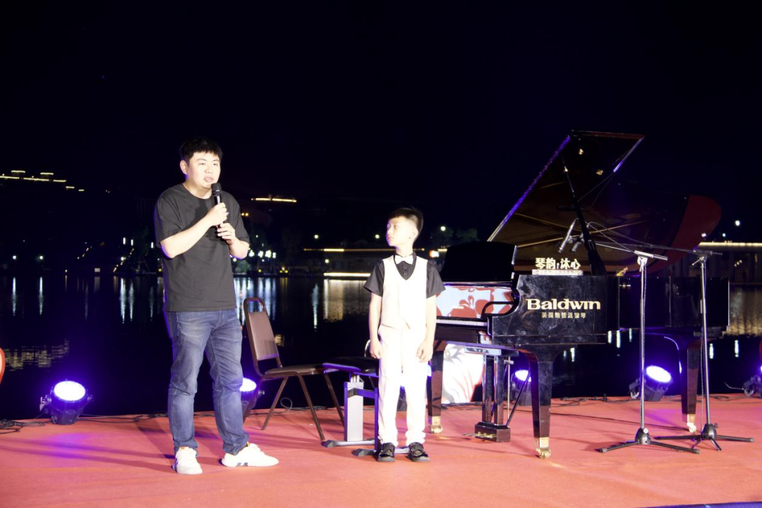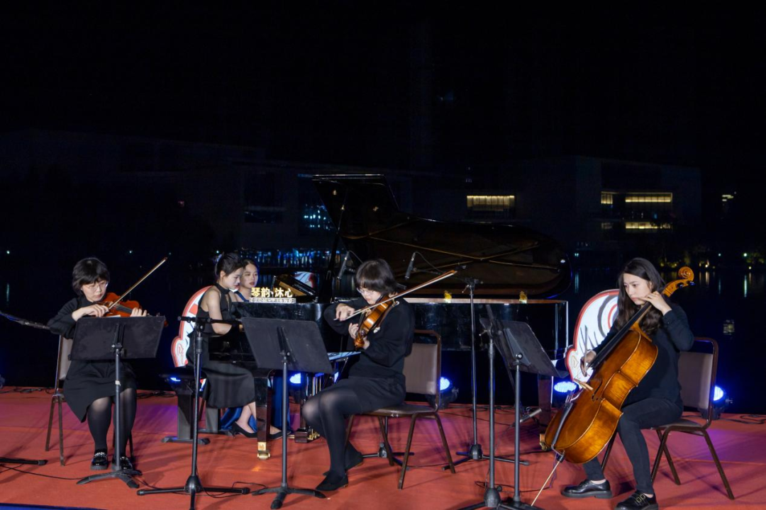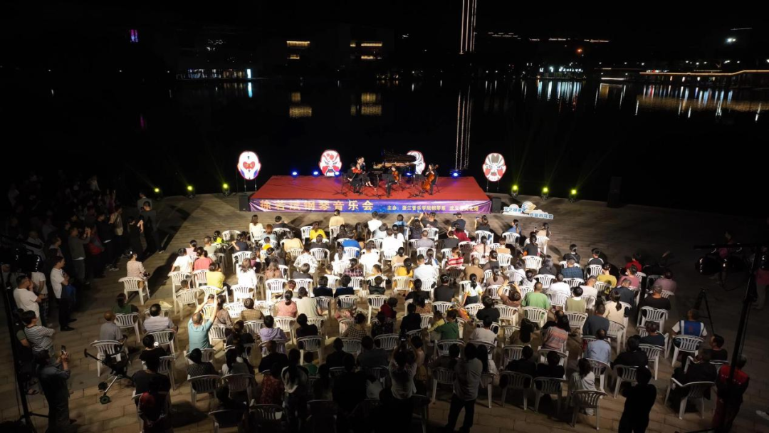 这场音乐会的演奏场地选在市民广场的湖面上,波光粼粼的湖面倒映着交错的灯光,悠扬的乐声伴随晚风飘荡,尽显浪漫气息。此次活动由浙江音乐学院钢琴系、武义县文化馆主办,音乐会主奏由钢琴系武义籍学生徐若斌、徐若珂等担任,在钢琴独奏曲《浏阳河》中拉开帷幕,包含了《舞狂》、《春舞》等中国近现代作品,以及《茉莉花》、《彩云追月》、《梁祝》等观众们耳熟能详的曲目,更有音乐大师莫扎特和勃拉姆斯的钢琴四重奏。钢琴系黄翔副教授还亲临现场给当地的钢琴爱好者进行指导。音乐会在弘扬、传播、继承中华民族优秀传统文化、体会中国本土音乐文化的同时,更让百姓们体验了中西音乐文化的交融,雅俗共赏。