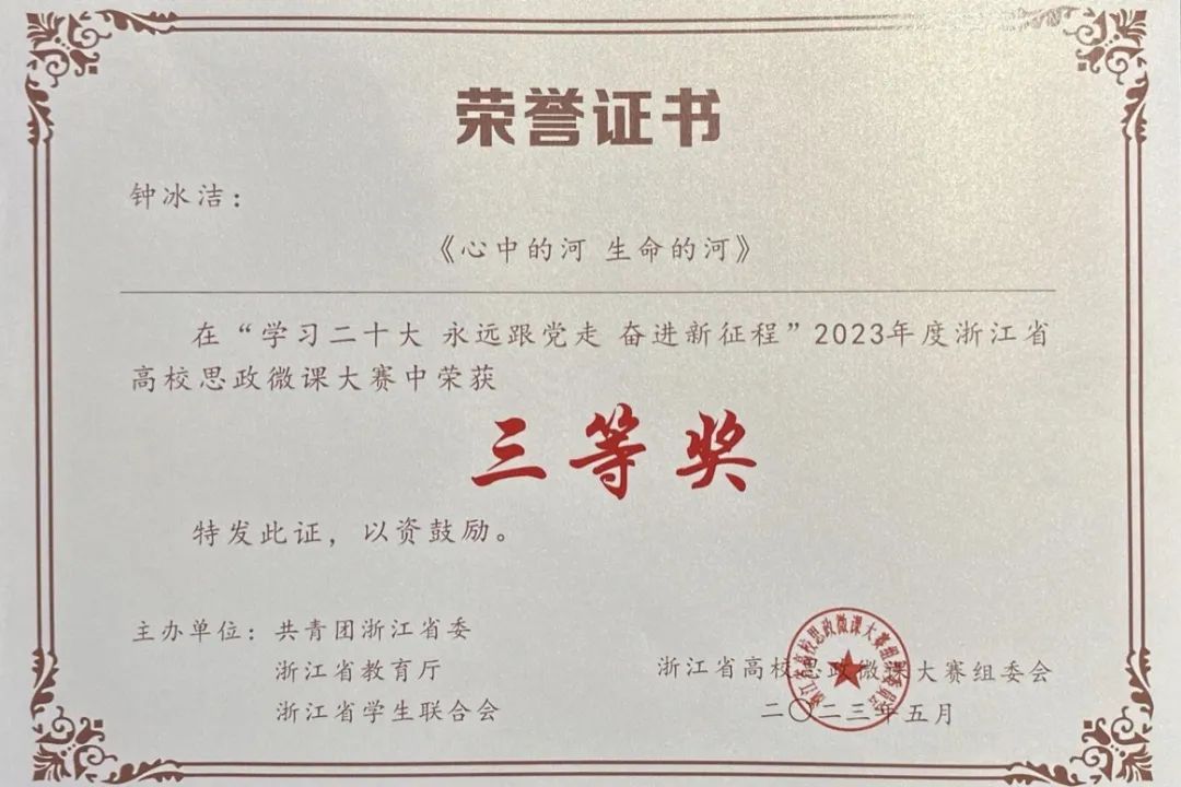 为深入学习宣传贯彻党的二十大精神,贯彻落实省第十五次党代会、省第十五次团代会精神,进一步强化对高校青年学生的思想政治引领,带领团员青年忠实践行“八八战略”,坚定捍卫“两个确立”,坚决做到“两个维护”,在奋力推进“两个先行”的新征程上唱响“我在窗口写青春”最强音,今年5月,共青团浙江省委、浙江省教育厅、浙江省学生联合会共同主办2023年度浙江省高校思政微课大赛,我院钟冰洁老师获教师组三等奖,李依雯同学获学生组三等奖。