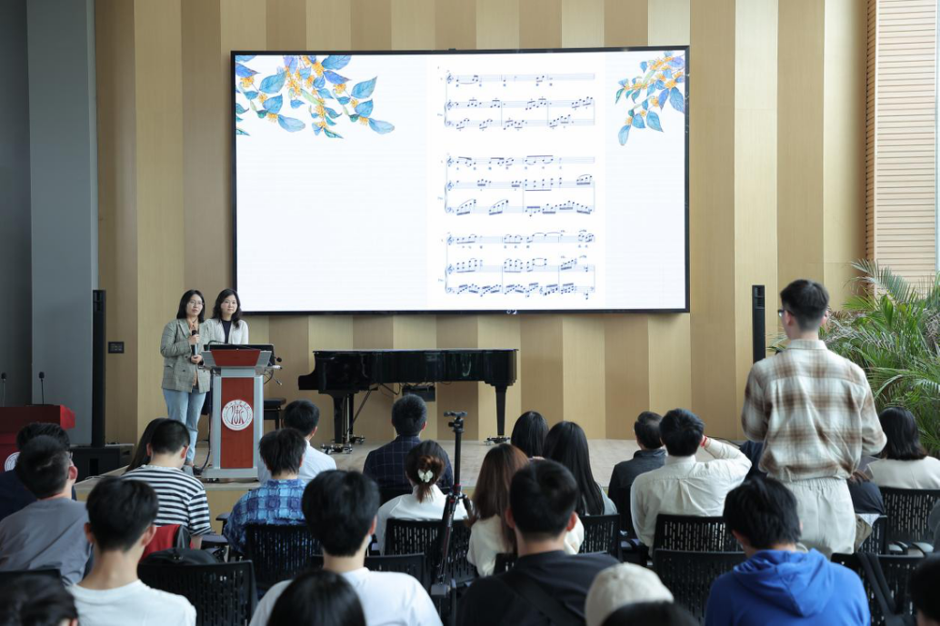 张泽艺用《红楼梦》原声主题音乐引出音乐创作中诗与乐的思考。她讲解了原创艺术歌曲《春题湖上》的创作思路和技法,强调用具有时代性的音乐语言传播古典诗词和现代诗歌,是当代作曲家的使命。