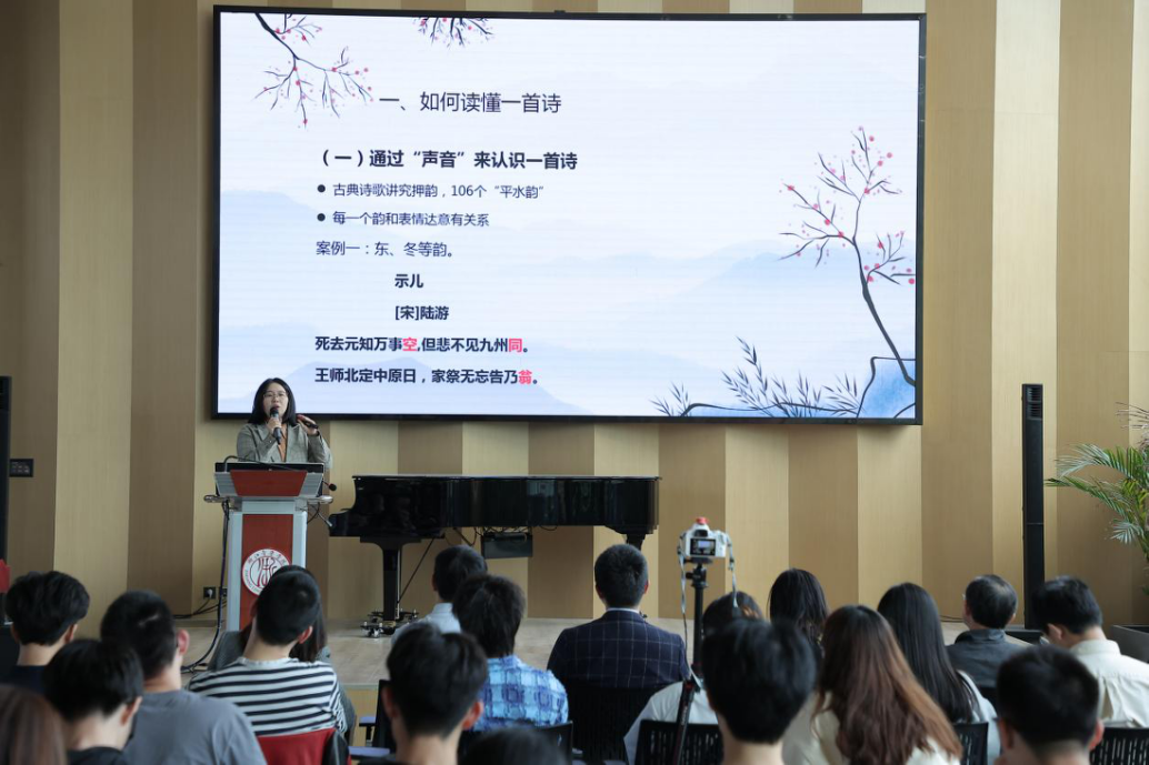 张童围绕如何读懂一首诗这一主题,通过对《夜雨寄北》、《洛桥晚望》、《春题湖上》、《致橡树》等经典诗词的解读,向同学们讲解了诗词是如何通过“声音”、“语意”等方式表达思想和情感,读者应如何体会诗词作品的音韵美和哲理性思想。