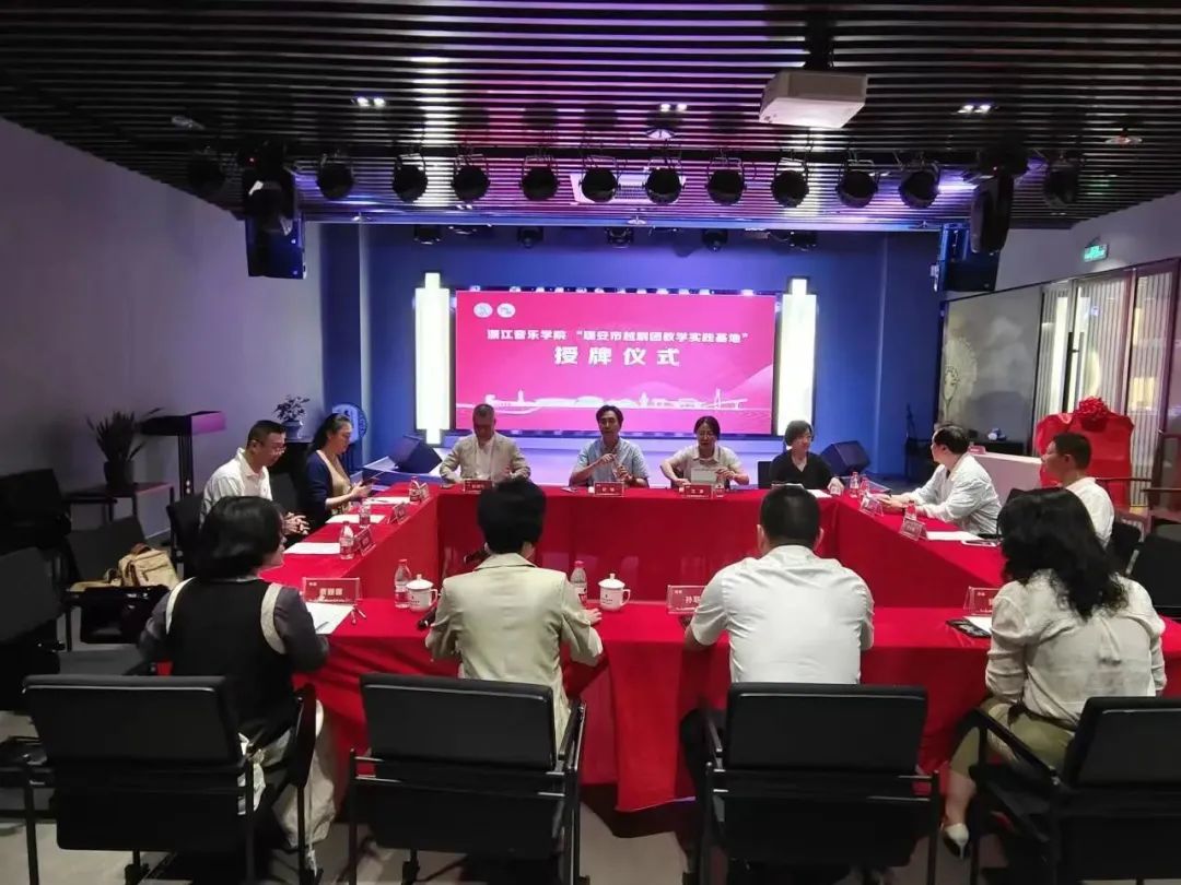 5月19日浙江音乐学院戏剧系与瑞安市越剧团教学实践基地的签约授牌仪式在瑞安市南戏传承研究中心顺利举行。浙江音乐学院戏剧系总支书记、副主任安怡,党总支副书记江珍,办公室主任吴婷婷、教工党支部书记、戏曲教研室主任阮明奇,戏曲表演教研室主任李公律,戏曲表演教研室副主任徐耀芳,系科研秘书张永明,戏剧学研究所特聘研究员蒋中崎,科研助理何方方,中共瑞安市委常委、宣传部长孙寒星,瑞安市文化和广电旅游体育局党委委员、副局长金铠,瑞安市文化馆馆长陈萍萍,瑞安市越剧团团长蔡丽娅等一行参加了签约授牌仪式。