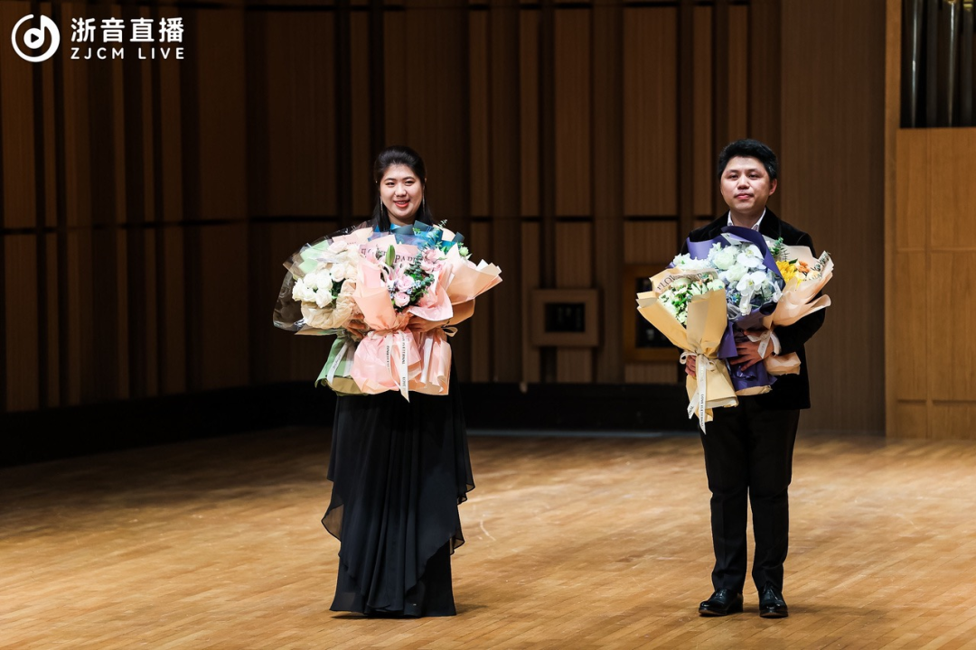 朱昊老师和陈小雨老师四手联弹世界首演的《之江新声》,一呼一应的演奏如同渔舟唱晚般,宁静清澈又美丽自然;乐曲发展到中段,节奏变得紧凑,欢快而充满活力,如同浙江人勇立潮头的改革精神。