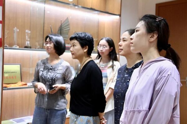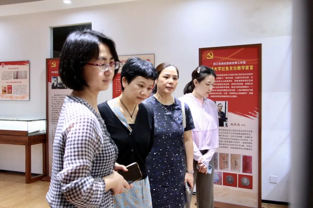 舞蹈学院党总支一行还在宁波大学马克思主义学院党委书记蒋开东陪同下参观了浙江省高校思政名师工作室宁波大学红色文化教学展室。据了解,该工作室通过展示红色文献、红色文物与马克思主义经典著作、思政课教材等红色资源,引导师生重温红色历史、品味红色经典、感悟红色精神,提升思政课教学质量。