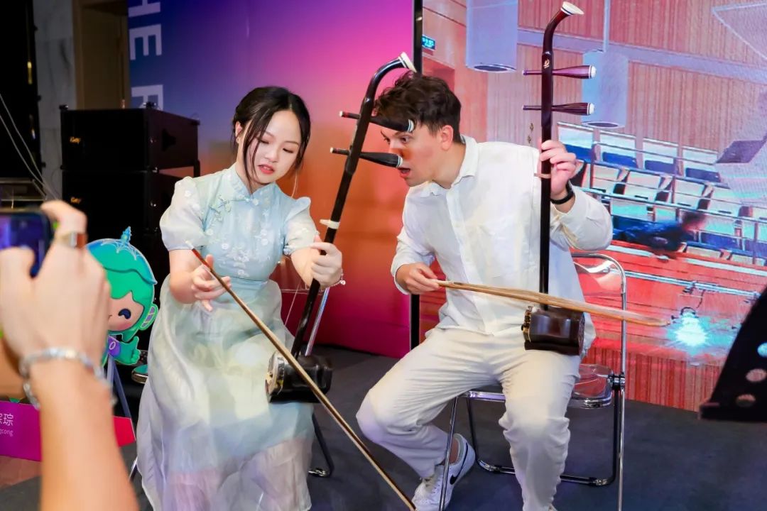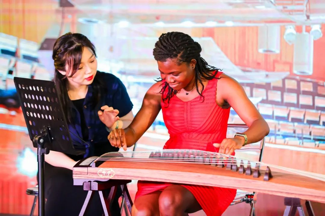 讲演会在《紫竹调》欢快的旋律中走向尾声,现场掌声雷动。演出结束后的互动环节,再次将现场气氛推向高潮,中外嘉宾纷纷上台,争相尝试弹奏民族乐器,同学们也是手把手进行教授和介绍,讲演会在欢快的交流中圆满结束。