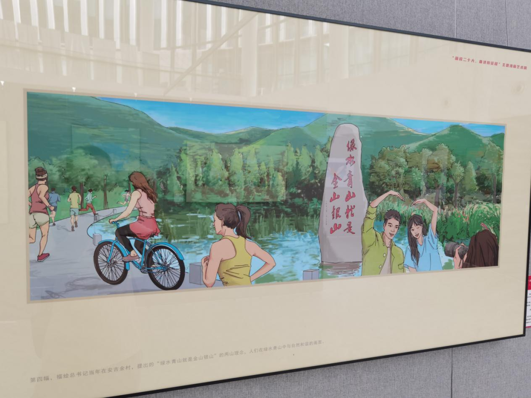 参观过程中,张亮兆老师结合参展漫画和课程内容给同学们讲解了“绿水青山就是金山银山”理念在浙江的提出和发展,以及浙江共同富裕示范区建设,深入解读了浙江在新时代中国式现代化建设中的重要地位和作用。