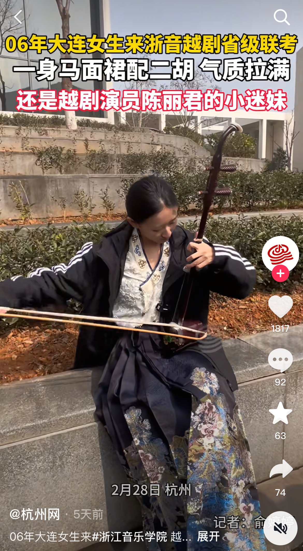 杭州网:06年大连女生来浙江音乐学院越剧省级联考,一身马面裙配二胡,气质拉满!还是越剧演员陈丽君的小迷妹