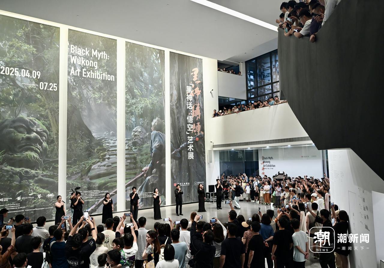 7月6日晚,一场全方位沉浸式艺术体验--“音艺无界·声动美术馆"系列公教活动之《黑神话:悟空》音乐现场,空降中国美术学院美术馆,为艺术及音乐爱好者与游戏玩家打造了一场沉浸式文化体验。活动特邀浙江音乐学院声乐歌剧系金久湝师生团队演绎。团队以《黑神话:悟空》游戏原声为表演内容,用美声、原生态、流行演唱等多元声乐形式,用声音传达游戏中的东方美学。现场观众掌声雷动、气氛热烈。
