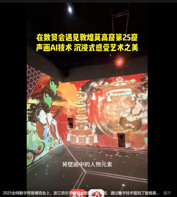 江苏新闻广播:2025全球数字贸易博览会上,浙江音乐学院联合敦煌文旅集团,通过数字技术复刻了敦煌莫高窟榆林窟内的壁画与雕塑,结合原创音乐、数字影像与交互技术,带领观众体验一个由光影、粒子与声景构建的 叙事时空。