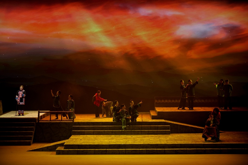 在艺术呈现上,作品巧妙运用1944年与2025年双时空交织的叙事结构,将畲族文化传统、抗战历史记忆、英士大学办学史与浙南山乡独特风貌融入叙事。值得一提的是,作品深度融合畲族文化元素。剧中蓝翠翠的唱腔保留了畲族山歌特有的颤音节奏,村民的集体舞蹈严格复刻了畲族“踏步摆腰”的传统动作,舞台上的每个画面都在诉说着浓浓的民族风情。