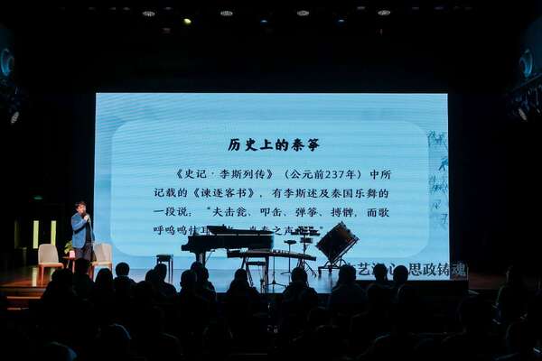 艺术思政导师周展带领“翡翠筝团”现场演绎了《姜女泪》《秦土情》《白桐曲——为纪念焦裕禄而作》《风之歌》《黄河》等多部经典筝乐作品。周展以“秦筝”导入,系统梳理了中国古筝艺术的历史源流、发展轨迹与创新实践。思政课教师徐施易结合《姜女泪》《秦土情》与周展进行深度对谈。