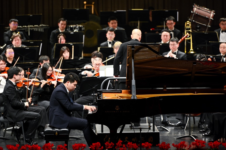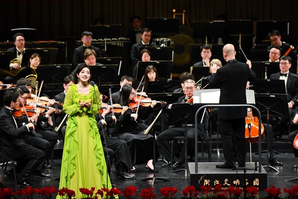 音乐会以一曲激昂的《鲁斯兰与柳德米拉》序曲激昂开篇。随后,古筝协奏《望云赋》以清透灵动的音韵勾勒出云卷云舒的东方意境,而歌剧选段《爱永在》则以深情的旋律吟咏出真挚隽永的家国情怀。琵琶协奏《丝路飞天》以繁复的指法与丰富的音色变化,再现丝绸之路上的风物与遐思。《鸟儿在风中歌唱》以极具艺术感染力的演绎,将深切而克制的悲情浸透于每个音符之中,直抵人心;《苗岭飞歌》则一转情绪,以清亮悠扬的嗓音唤醒山野间蓬勃的生命气息,宛如晨光穿透层林。