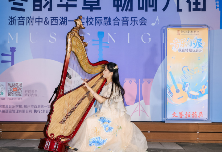 在正式演出开始之前,浙音附中学子在九街景区开展浙江音乐学院“我在转塘玩音乐”文艺赋美品牌项目“音乐小屋”首秀。