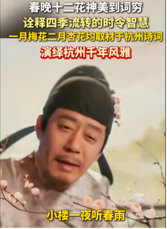 该节目主打“文化+科技”的融合创新,以“花”为意象,通过AI生成影像与实景舞台扩展技术,呈现四季更迭的自然意趣,诠释生生不息的美学意蕴。正月梅花、二月杏花,均取材于杭州的诗词。正月梅花——“疏影横斜水清浅,暗香浮动月黄昏”,作者林逋一生爱梅,隐居杭州孤山后留下一段“梅妻鹤子“的佳话;二月杏花——“小楼一夜听春雨,深巷明朝卖杏花”,陆游用诗绘出江南春雨后,杏花飘香的清新画面,如今去孩儿巷陆游纪念馆,依旧可以赏“小楼春雨”。