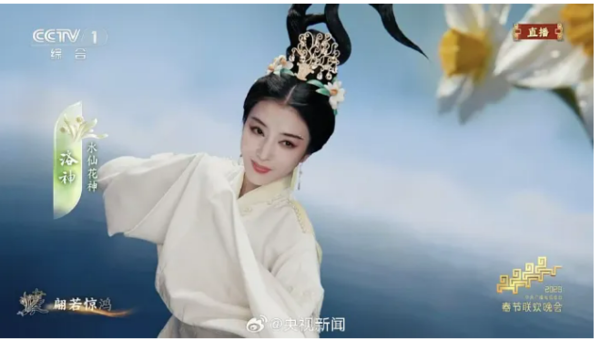 歌咏创意秀《贺花神》梦幻上演,浙江小百花越剧院青年演员李云霄化身十二月的水仙花神,洛神雪白水袖翩跹,翩若惊鸿、婉若游龙。