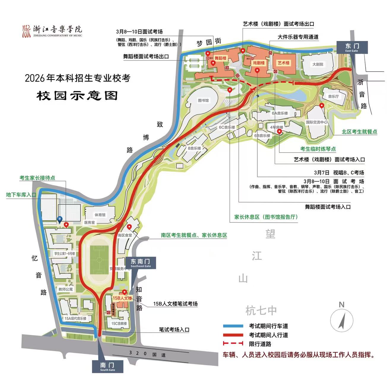 3月7日—10日,学校开放东1门、东大门、南门、东南门,在艺术楼(戏剧楼)、舞蹈楼参加面试考试的考生,建议从浙音路东1门(行车道)或东大门(人行道)进入校园;在南区15B人文楼参加笔试考试的考生,建议从南门、东南门进入校园。如乘坐地铁6号线到浙江音乐学院站,可从“浙江音乐学院南门”进入校园。