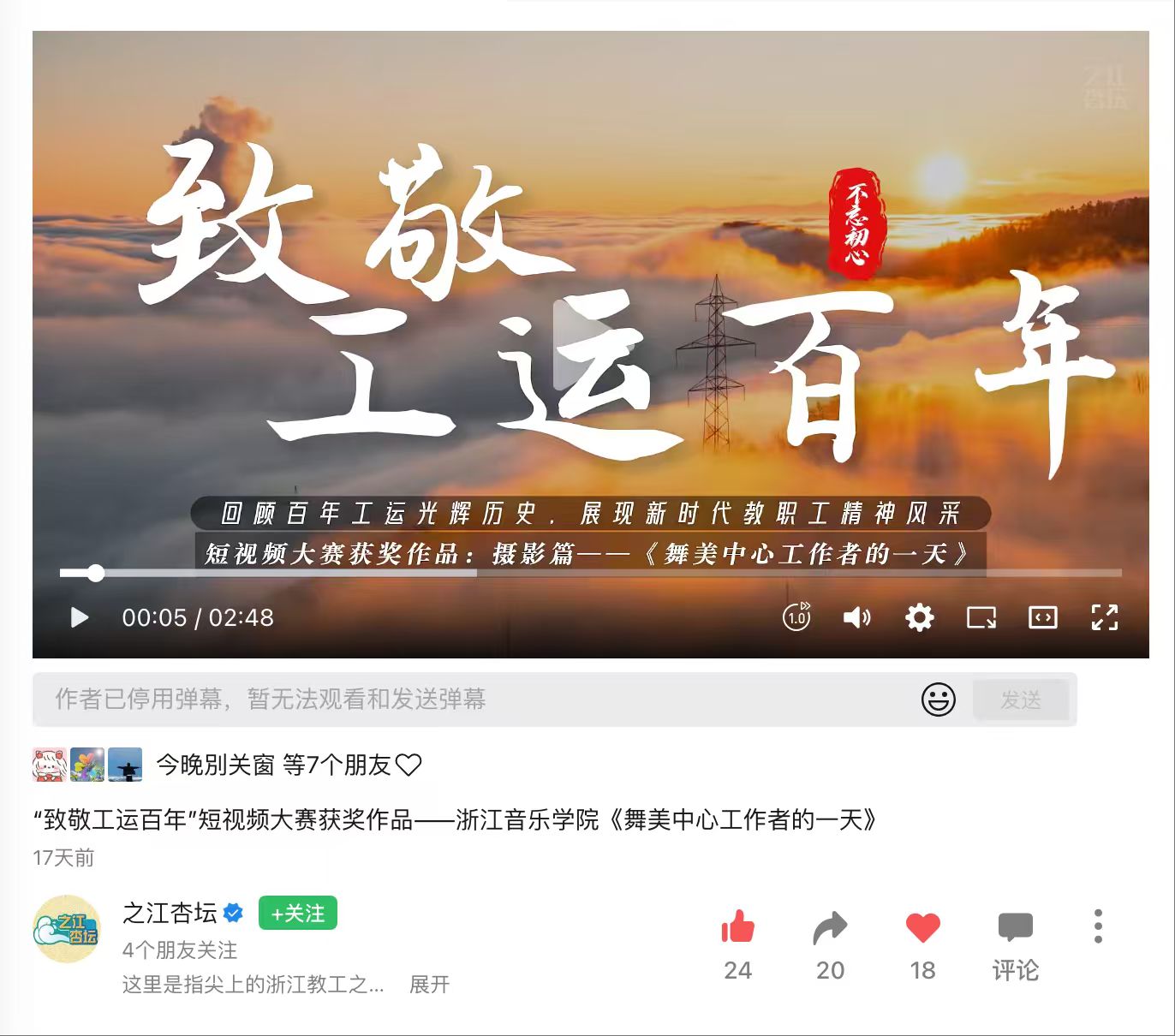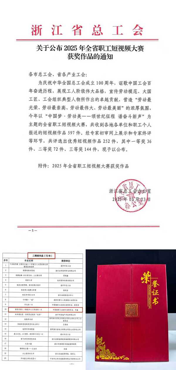 近日,在浙江省教育工会主办、“之江杏坛”视频号与浙江大学工会共同承办的“致敬工运百年”2025浙江省教职工短视频征集活动中,由浙音乐典文化选送的纪实短视频作品《舞美中心工作者的一天》从众多参赛作品中脱颖而出,荣获大赛二等奖及“最佳摄影奖”两项荣誉。