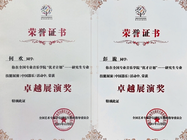此外,国乐系研究生彭旎(指导教师:杜如松)与何欢(指导教师:何娜),荣获“卓越展演奖 ”和“卓越展演奖指导教师 ”,并在上海音乐学院贺绿汀音乐厅进行表演交流。