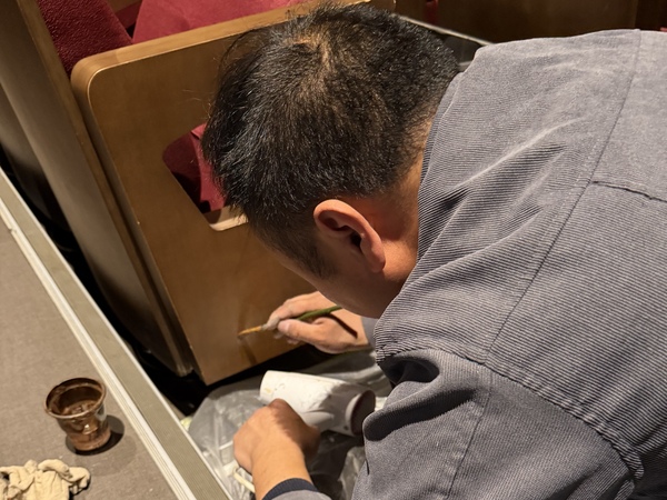 本次修缮严格遵循“修旧如旧、提质增效”的原则,邀请经验丰富的专业技师团队,逐一对每张座椅进行全面排查,结合木饰面材质特性与破损程度,量身定制差异化修缮方案。施工过程严格执行标准化操作,全程精细化把控打磨、修复、上色、防护等每一道工序,确保修复后的木饰面在纹理、色泽上与原饰面高度统一。同时通过专业工艺强化耐磨、防潮性能,有效延长设施使用寿命,实现修复效果与使用品质双提升。为最大限度降低施工对演出排期与观众观演体验的影响,浙音演艺采用“分区、分批、错峰”施工模式,将作业精准安排在无演出时段或观众离场后进行,现场配备专人全程督导,严格把控施工质量、安全与文明作业,真正做到“修缮不扰演、服务不缺位”,在保障场馆正常运营秩序的同时,守护观众舒适观演感受。