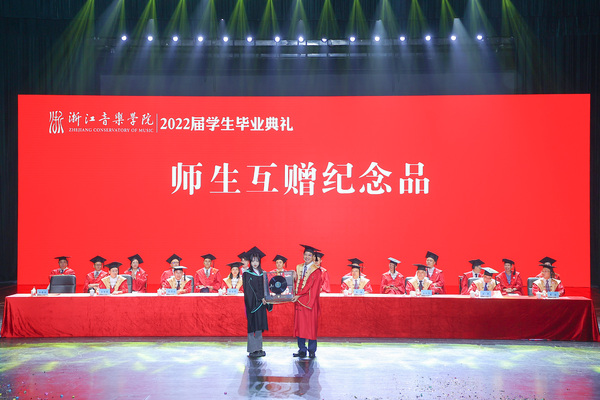 党委书记干武东与毕业生代表交换赠品。他饱含深情地祝愿毕业生在人生新的旅程中找到属于自己的绚丽舞台,以青春之我奏响梦想之歌,以奋斗之我舞出精彩人生,在祖国广袤的大地上镌刻浙音人的自强、自信、自豪,在逐梦的征程里勇毅勤勉、笃行致远,并表示,母校是浙音人永远的港湾,常回“家”看看,期待大家捷报频传、凯歌不断。