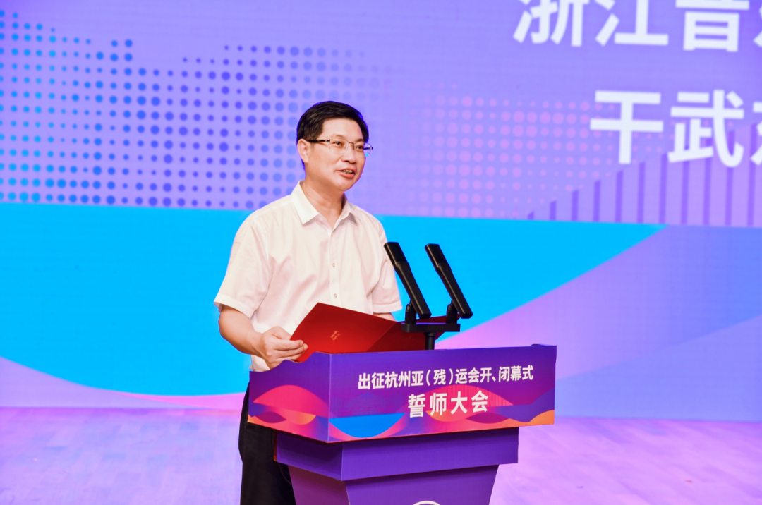 学院党委书记干武东作动员讲话。他指出,承担亚(残)运会群演工作是省委、省政府和亚组委交给学院的政治任务,此次出征誓师大会彰显了浙音师生服务亚运盛会的决心和信心,展现了浙音师生的活力和风采。他勉励大家,不负重托、不辱使命。要提高政治站位、强化思想认识,心怀“国之大者”,以强烈的责任感、使命感和荣誉感,用高水平的演出完美诠释浙音精神,展示浙音形象。遵守纪律、团结协作。要服从亚组委的排练安排和统一指挥,严格执行亚组委和学院的各项纪律要求,充分发扬团队协作精神,在圆满完成各项排练演出任务的同时,充分展现浙音学子的良好形象。他还叮嘱同学们保重身体、注意安全。学院的工作专班和带队教师将尽一切可能为同学们提供最有力的服务保障,并期待大家圆满完成演出任务、凯旋而归。