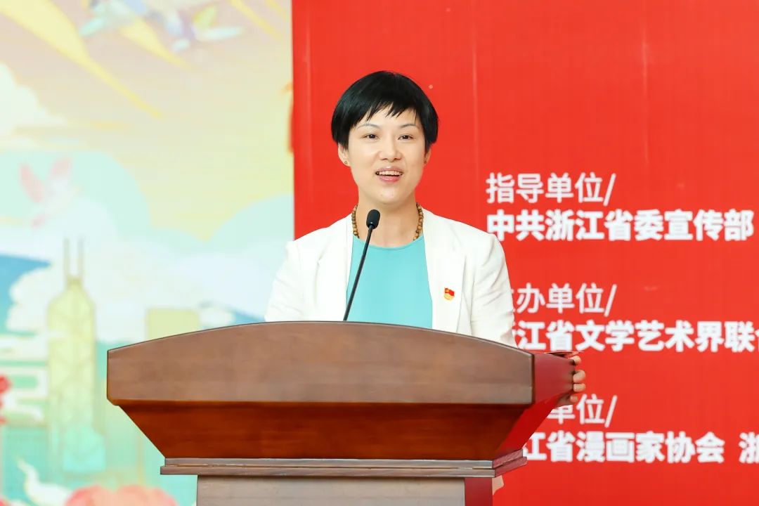 蒋婷简要介绍了漫画册出版历程和重要意义,分享了其中代表作品。她表示,通过漫画进高校这一活动形式,能够让广大青年以“读图”的方式,更加生动、直观、深刻地领会党的二十大精神的核心要义,了解新时代这十年来国家取得的显著成就,不断厚植家国情怀,树立文化自信。她表示,浙江教育出版社期待继续与社会各界携手,用艺术语言讲好中国故事,用传媒力量号召青年群体追随时代热点,为国家发展贡献力量。