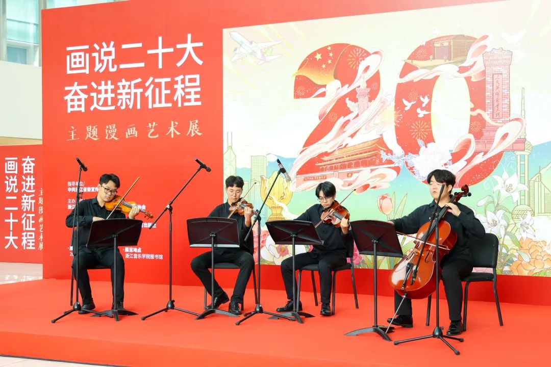 陶小明表示,在深入开展学习贯彻习近平新时代中国特色社会主义思想主题教育之际,主题漫画艺术展从浙江展览馆出发,深入乡村、企业、学校,来到了全省唯一的音乐艺术本科高校具有重要意义。此次艺术展中,漫画发挥文艺轻骑兵作用,通过喜闻乐见的绘画形式,将党的二十大精神呈现出色彩鲜艳、内容丰富、艺术感染力强的画面感。与此同时,音乐是有声的绘画,绘画是无声的音乐,二者碰撞在一起,共同奏响了主题漫画欢快动人的乐章,讴歌了伟大的新时代和奋进新征程的雄壮节奏。他相信,在与社会各界的真诚合作中,艺术的道路会越走越宽广。