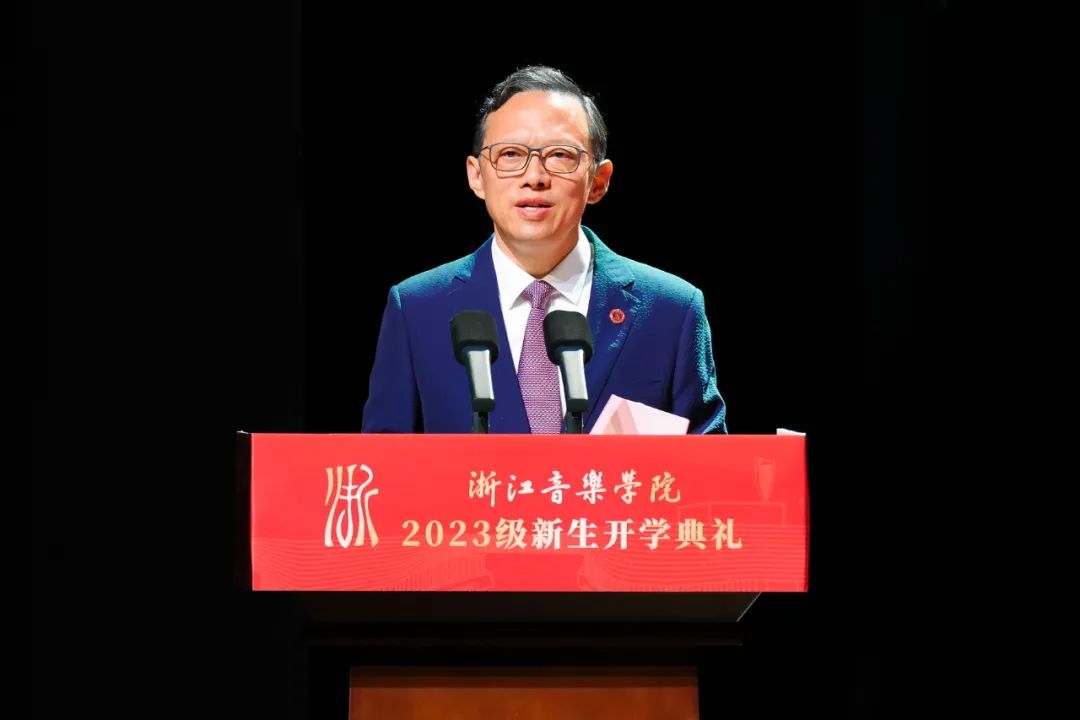 国乐系徐子杰代表本科新生发言。他表示,很荣幸能在学期伊始代表学院出征此次亚残运会开幕式活动及亚奥理事会110周年庆典活动,在“大莲花”展现我们浙音学子的精神风貌。当下,青春是用来奋斗的;将来,青春是用来回忆的。在浙音成长、在浙音收获,这段旅程将充满惊喜、充满发现。我们将以艺术为桥梁,谱写精彩人生,书写艺术华章。