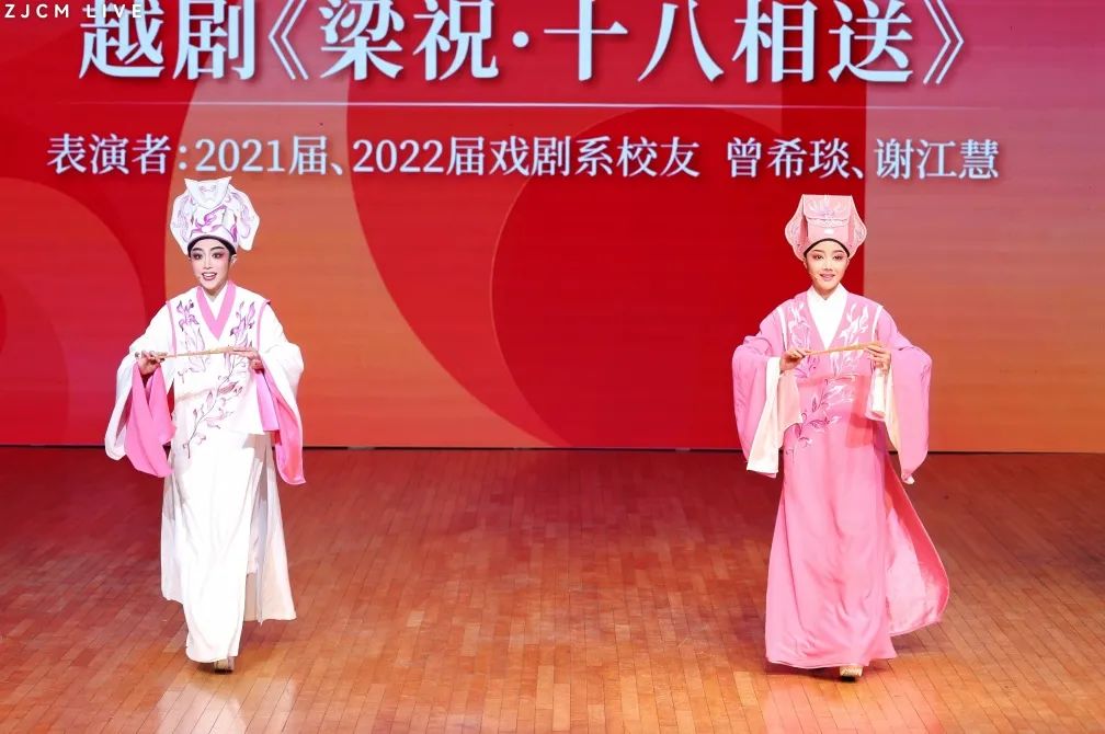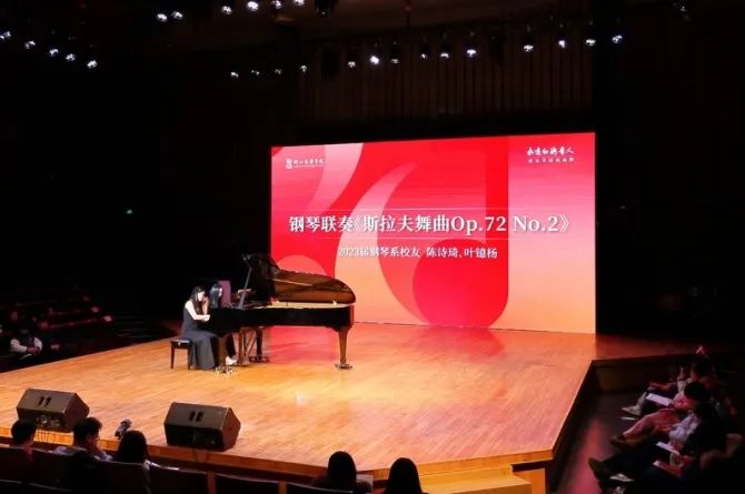现场,由20余位毕业校友与各院系在校生联袂带来精彩的文艺演出:歌剧咏叹调《斗牛士之歌》、舞蹈《寒依疏影》、笛曲《扁舟载月》、钢琴曲《斯拉夫舞曲Op.72 No.2》、歌曲《爱》、越剧《十八相送》、古筝《梦回临安》、阿卡贝拉《Fly me to the moon》......一出出精彩的节目承载着一段段美好的青春回忆,表达了校友们浓浓的爱校深情。
