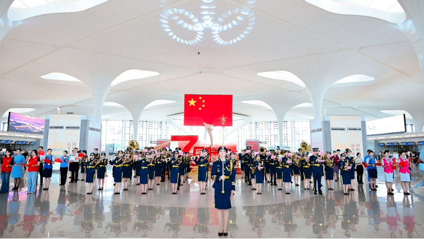 在萧山机场,浙音70余名“文艺轻骑兵”与冠军健儿、省属企业青年、现场游客一起,以歌曲快闪、花车管乐巡游、青春宣讲等形式,为祖国庆生。残奥会冠军、中国首位国际残奥委会运动员委员会委员谭玉娇也参与到“文艺轻骑兵”的赋美活动中,大家共唱《在希望的田野上》《祖国不会忘记》等曲目,旅客被热烈欢庆的情绪深深感染。