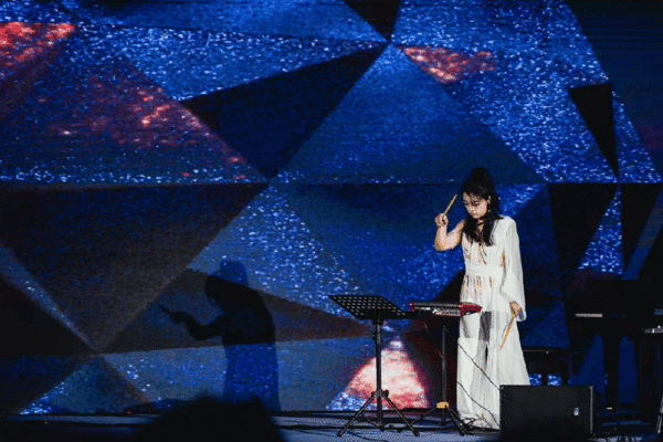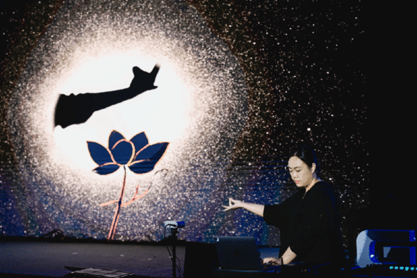 音乐会上半场以《星体》为开场,这部作品运用MediaPipe技术,将手势和姿势识别数据转化为音乐参数,创造出一种全新的表演形式;《明乐新声》将明代琵琶与实时电子音乐相结合,让古老乐器在数字时代焕发新声;《弦语千机》为古琴与一千部手机而作,通过大规模移动设备协同发声,构建出传统与现代的对话场域;《拈花化影》通过实时AI生成影像,实现了音乐与视觉的同步创造。