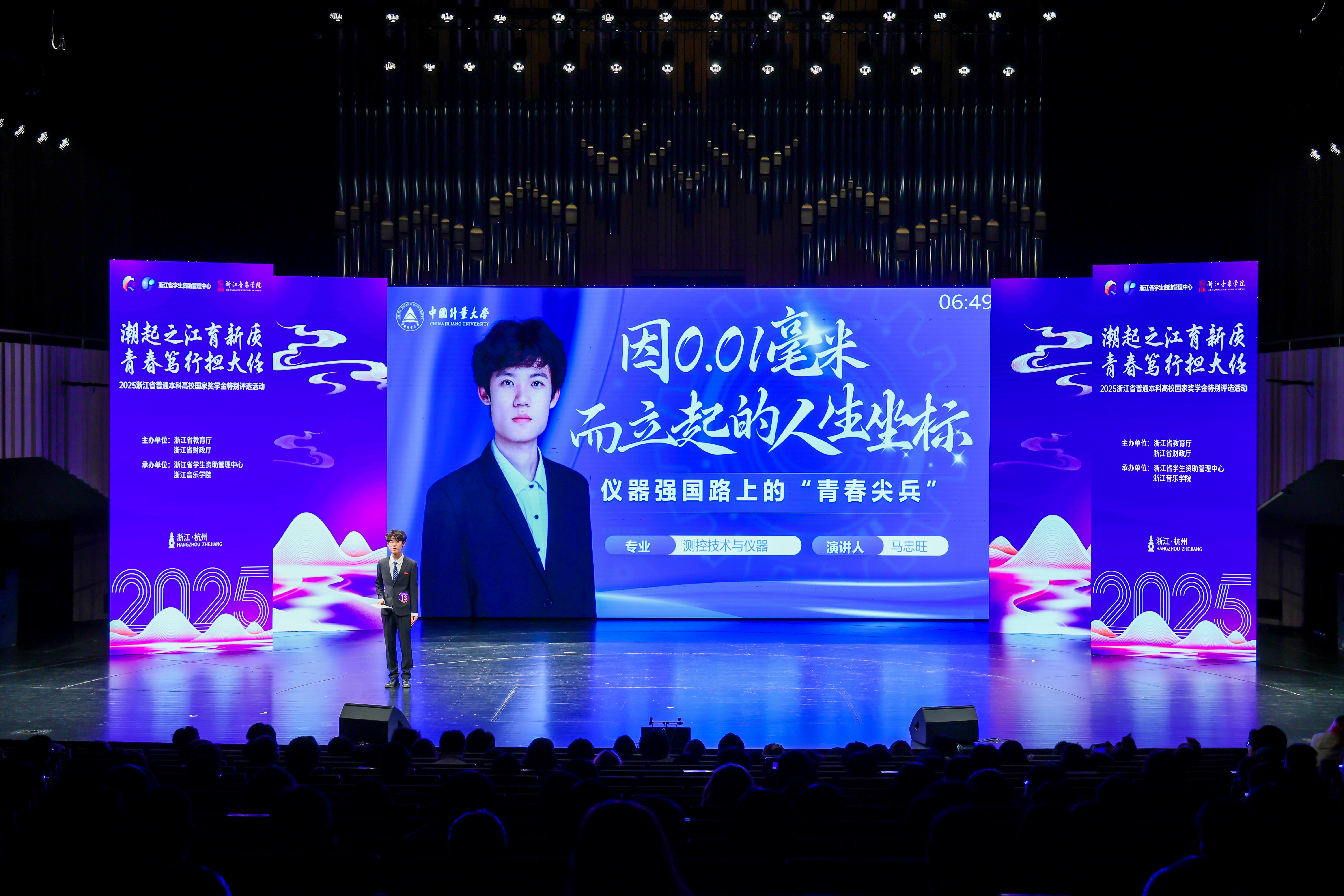 活动现场,由流行音乐系学生韩甜甜、唐澜、汪竑宇和张翼鏖演唱的浙江省国家奖学金特别评选活动主题曲《青春在场证明》正式发布,旋律激昂、词句铿锵,共同见证青春不悔、奋斗有声。这首歌的诞生本身正是一场“共同成长”的实践,歌曲词作者,来自浙音音乐教育学院学子符桢桢说,《青春在场证明》想要表达的是,所有磨砺都在酝酿破晓的光,青春的航线永远指向远方,通过选树榜样典型,激励更多大学生勇攀高峰、矢志报国。