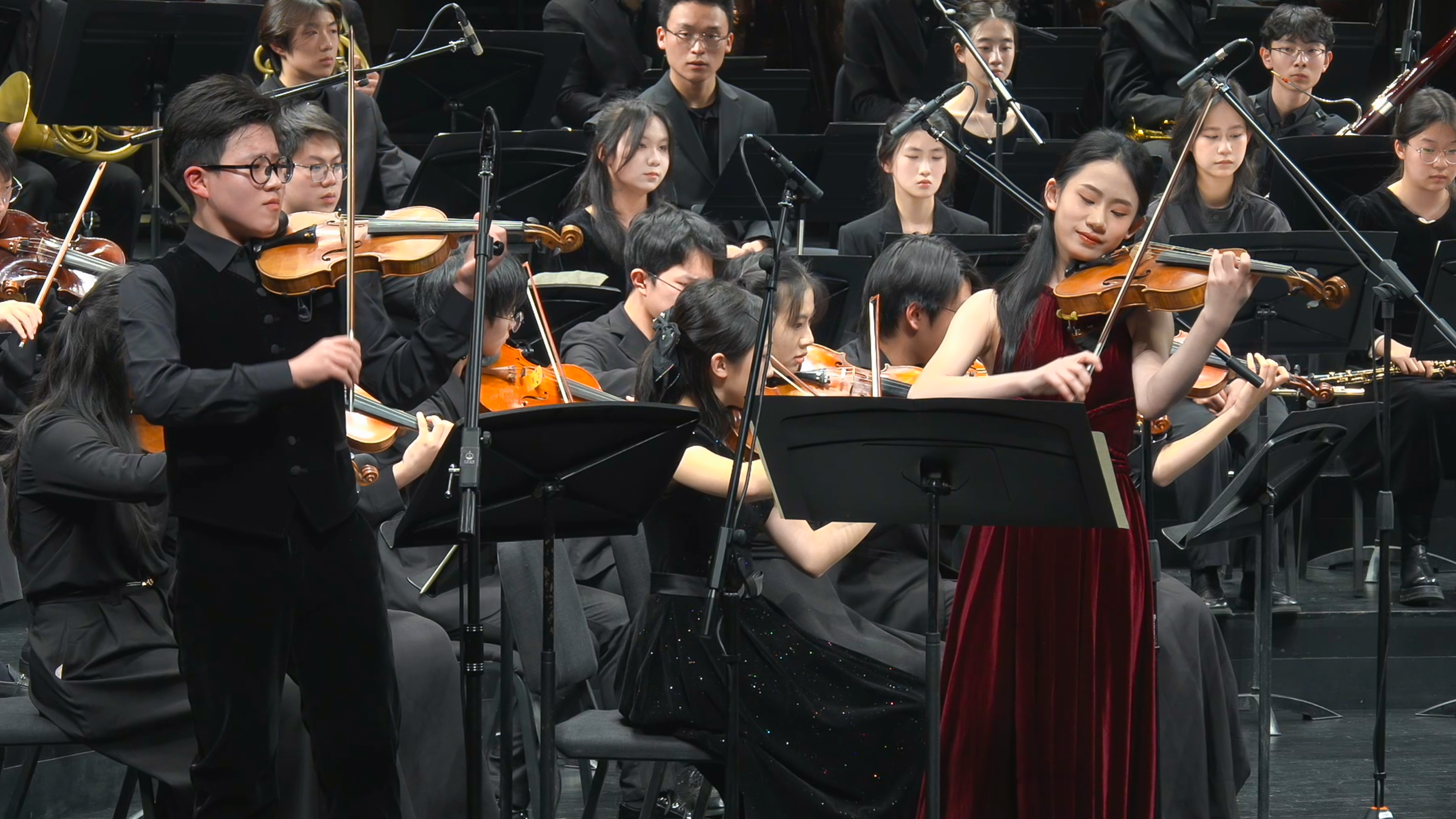 莫扎特《第十双钢琴协奏曲K.365》则由附中副校长吴晓、钢琴主科教师陈在田联袂呈现。这是莫扎特唯一的双钢琴协奏曲,两台钢琴在音符间彼此倾听、相互托举,与乐团形成严密而自然的呼吸关系。这里既有成熟演奏者对结构与风格的从容把控,也有学生乐手的信任与成长,仿佛一种无需言说的默契——师生在同一音乐语境中彼此理解、共同完成,而舞台也成为最直观的教学现场。
