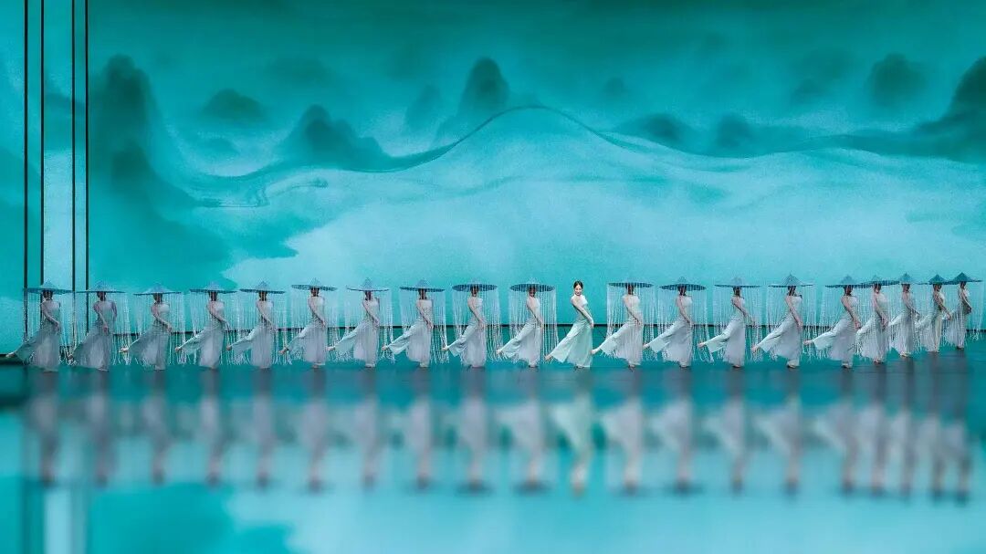 该作品以杜甫诗意为魂,以“雨”与“船”为眼,垂帘斗笠摇曳出斜风细雨,步履如墨勾勒出青山远黛。舞者以小而细碎的动作,展现出诗词中对雨不同形态的描述,如“廉纤”“跳珠”“银索”“斜风细雨”等,在动静相宜间完成对江南品格的美学定帧。舞者们不断变换队形,展现如“轻舟”“屋檐”“远山”等中国古典意蕴的诗意构图,让这场跨越千年的春雨在当代舞台上“润物无声”。