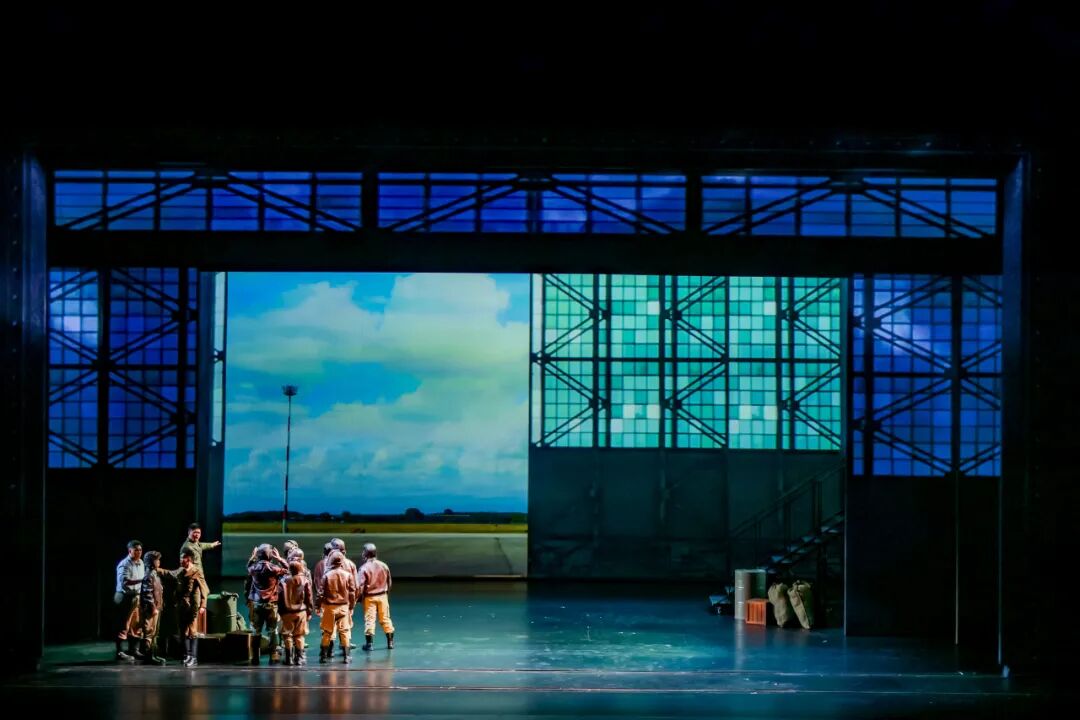 “本剧情景多、变化频繁、多时空并列,迁换需要快速高效。”丁丁介绍,为此,他在舞台三分之一深处,设置了一组可以开合的“云”景片,在深度上分割舞台空间,功能上则保证前区演出时后区换景的遮挡需要,“云开云合”完成瞬间的空间重组、传递信息和情感,增强艺术感和观赏性。加之现场以冷峻的钢铁结构象征战争的残酷与男性的阳刚,配合多媒体技术营造空战的激烈效果,最终呈现极具冲击力的视觉画面。
