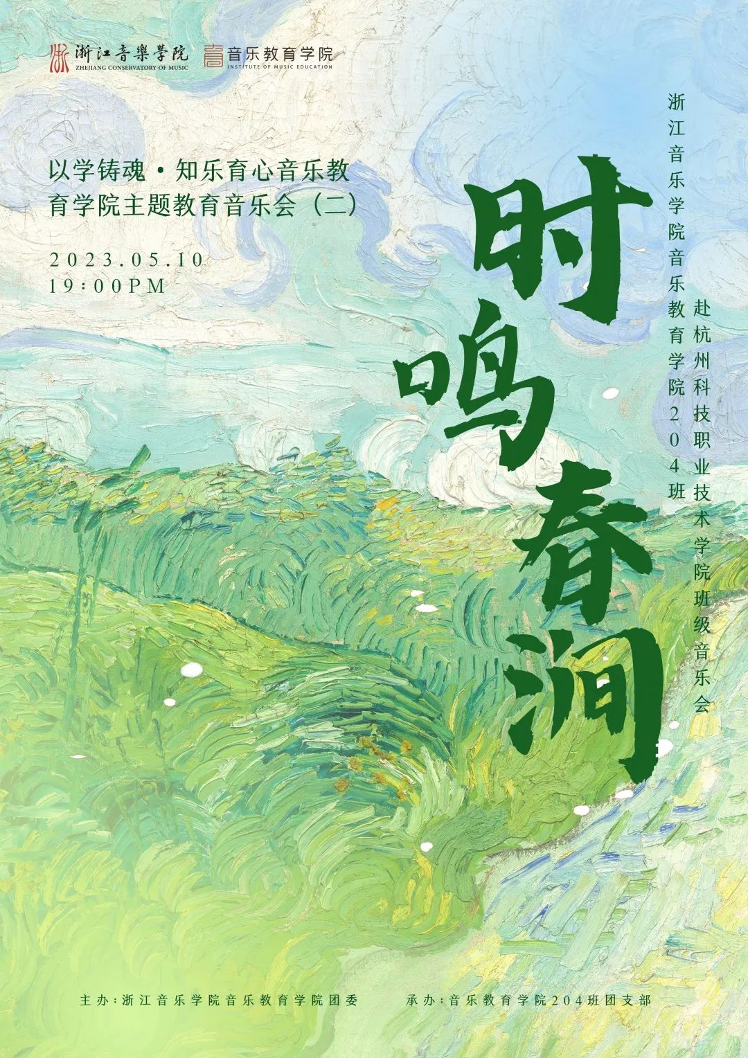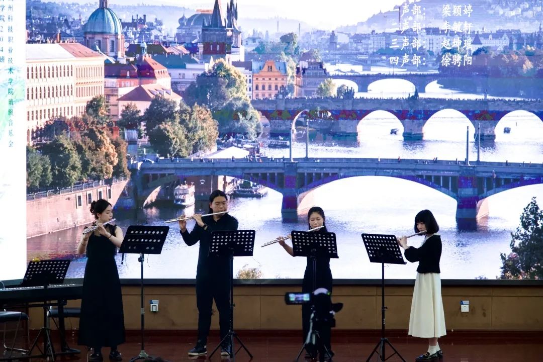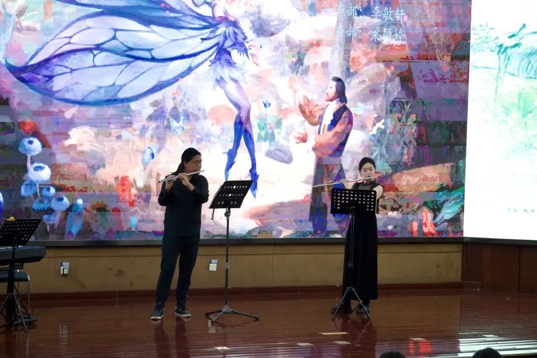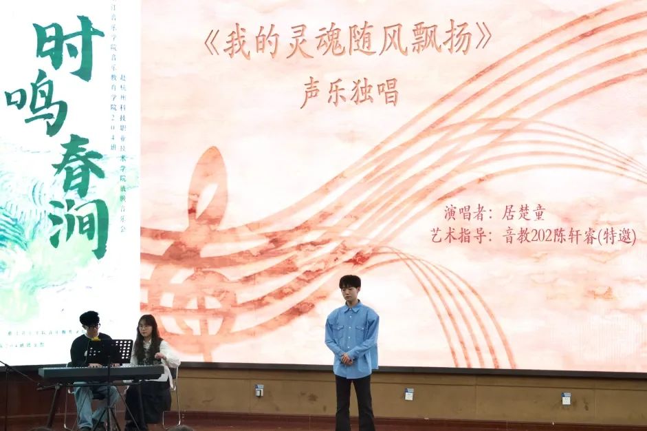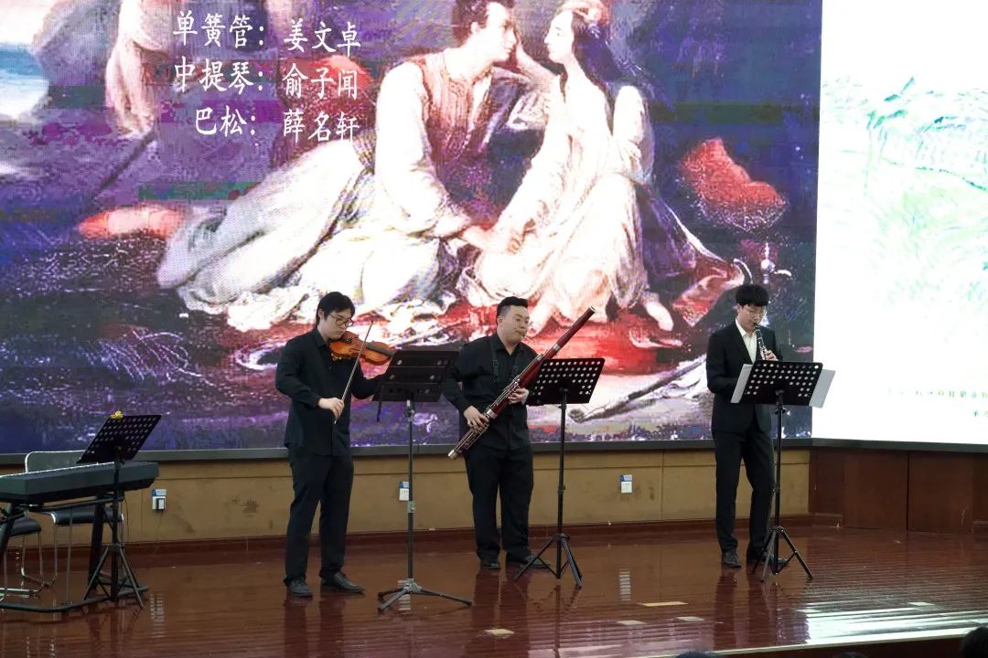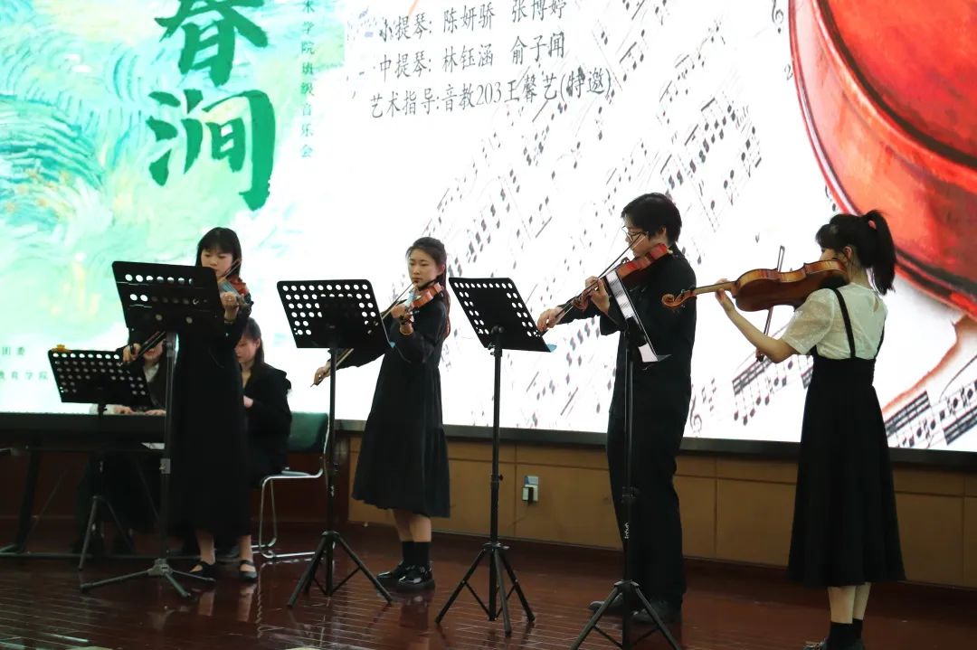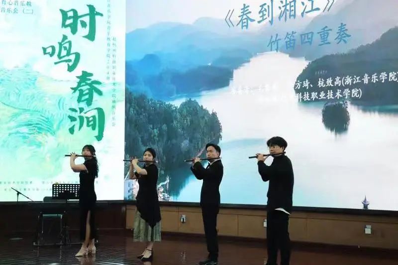 音乐教育学院组织班级赴杭州科技职业技术学院开展文艺宣讲音乐会 为深入推进学习贯彻习近平新时代中国特色社会主义思想主题教育,音乐教育学院组织音教204班的同学们走出学校,走进杭州科技职业技术学院开展了一场推动高雅艺术进校园、弘扬民族文化的学习实践活动。  全体同学在音教学院团委书记、学工办主任张冉冉老师、班主任林静老师及全体辅导员的带领下来到杭州科技职业技术学院,开展了一场别开生面的艺术宣讲班级音乐会。两校的同学们一起用琴声展现自我,描绘时代青春;用舞蹈传递力量,焕发青年活力。 一、重奏    长笛重奏曲《沃尔塔瓦河》等以丰富的表现力与优美的音乐而广为流传。无论是结构还是音乐上都通俗易懂,曲调明快、欢乐,是人们幸福生活、开朗情绪的写照,展现了神话般的幻想、大自然的神秘色彩和诗情画意。   弦乐四重奏和管弦重奏的两首作品演奏,让观众们陶醉其中,带来视听上的一种别样的感受。  古筝的灵动与弹性,代替了钢琴丰富多彩的和弦铺垫与打击乐复杂多变的节奏,使《动感弹拨》整首乐曲充满了现代气息及火热的激情,既有拉美流行音乐的韵律,又不失中国传统音乐的风味。  琵琶二重奏《彝族舞曲》以抒情优美的旋律,粗犷强烈的节奏,描绘了迷人的夜色和人们欢乐舞蹈的场面,富有浓郁的民族特点和强烈的时代气息。   笛子四重奏《春到湘江》表现了湘江两岸秀丽的春光和人们欢欣鼓舞建设家园的壮志豪情。以其鲜明的湖南花鼓音乐特色,时而激情如火,时而流畅清雅的旋律,而被广为流传。作为江南丝竹八大曲之一的《中花六板》,旋律清新流畅,细腻柔美,富有浓郁的江南韵味,是江南丝竹的代表曲目。 二、独唱、独奏    声乐独唱歌曲《我的灵魂随风飘扬》是一首追忆曲,“故人并不是离开,而是在这自然的风中一直停留在你身边”。爱和慰藉随风飘扬,世间美好与你环环相扣。 琵琶独奏《云想·花想》,洋溢着浪漫的情怀,把人们带进古朴、婉转的乐章中,充分展现了琵琶的独特魅力,展现了如诉如泣、娓娓道来的深切情丝。 笛子独奏以高昂明亮的曲调表现出风光明媚的秀丽春晨景色。从缓慢叙述着浪漫的情愫,到呈《春风夜雨情》现出两情相悦的欢乐情感,最后以思念的心情,结束在甜美的记忆里。 三、合奏  《花儿与少年》取材于青海民歌,融入了“花儿”的旋律。其曲调高亢悠扬,歌曲表达自由率真,有“西北之魂”之称,是一首流传地域广泛的具有西北特色的民族音乐。 《花好月圆》该曲采用带再现的单三部曲式,旋律简洁欢快,朴实自然,感情真挚,意境深远,抒发了人们乐观的情绪和对美好前景的憧憬与追求。 四、舞蹈  来自杭科院T.B.E街舞社的负责人和大一新社员,会在流行音乐《Antifragile》的动感节拍中通过多变而又整齐的齐舞展示出青春与活力,用他们动感的舞姿解放灵魂,撑起美的曲线。 这是一场专业与实践相结合的音乐会,从器乐、声乐到舞蹈,从独唱、独奏到重奏、协奏与合奏,从传统民族音乐到西方经典音乐和影视流行作品,音教204班的同学们充分发挥自身特色与优势,带来了内容形式丰富多彩的音乐盛宴。一首首蕴含着不同时代特色、民族情感的作品萦绕在所有师生们的耳畔和心中。