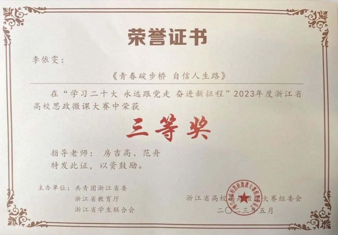 舞蹈学院师生在浙江省高校思政微课大赛中获得佳绩为深入学习宣传贯彻党的二十大精神,贯彻落实省第十五次党代会、省第十五次团代会精神,进一步强化对高校青年学生的思想政治引领,带领团员青年忠实践行“八八战略”,坚定捍卫“两个确立”,坚决做到“两个维护”,在奋力推进“两个先行”的新征程上唱响“我在窗口写青春”最强音,今年5月,共青团浙江省委、浙江省教育厅、浙江省学生联合会共同主办2023年度浙江省高校思政微课大赛,我院钟冰洁老师获教师组三等奖,李依雯同学获学生组三等奖。  《心中的河 生命的河》钟冰洁 课程以舞蹈作品《一条大河》为切入点,依托舞蹈与音乐的特殊艺术感染力,唤醒学生坚毅爱国的奋斗精神,由教师党员结合自身经历,从前期创作、排练过程、表演呈现三个方面生动讲述,感受舞蹈背后文化浸润的诚挚心灵,勉励新时代文艺工作者锻造勇于创新的开拓精神、一丝不苟的敬业精神和铸魂育人的奉献精神。  《青春碇步桥 自信人生路》李依雯 本微课紧紧围绕央视春晚《碇步桥》团队成员攀登艺术殿堂高峰时的心境,并凝练出“戮力同心、迎难而上、精益求精、为浙争光”的“碇步桥精神”,以此激励更多的青年文艺工作者,让更多优秀的文艺作品在全国人民面前呈现,让全球人民感受到“诗画江南、活力浙江”的美丽图景,这是浙江文艺工作者所肩负的使命和担当。  在中国共产党成立102周年之际,在全党上下深入开展学习贯彻习近平新时代中国特色社会主义思想主题教育之际,舞蹈学院师生充分发挥专业优势,多次组织文艺轻骑兵、文艺宣讲团深入基层,丰富人民群众的文化生活,增强人民群众的文化自信。未来,希望舞蹈学院全体师生踔厉奋发、接续奋斗,创作更多深入人心的优秀文艺作品,为实现中国式现代化贡献文艺力量。