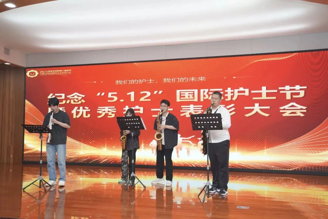 本次的演出节目是刘程、赫志豪、赵家桢、李晨四位同学带来的萨克斯重奏《人生的旋转木马》和耿露宇同学带来的歌曲演唱《如愿》。他们精彩的演出受到了出席表彰大会领导、医护人员以及社会各界人士的一致好评。