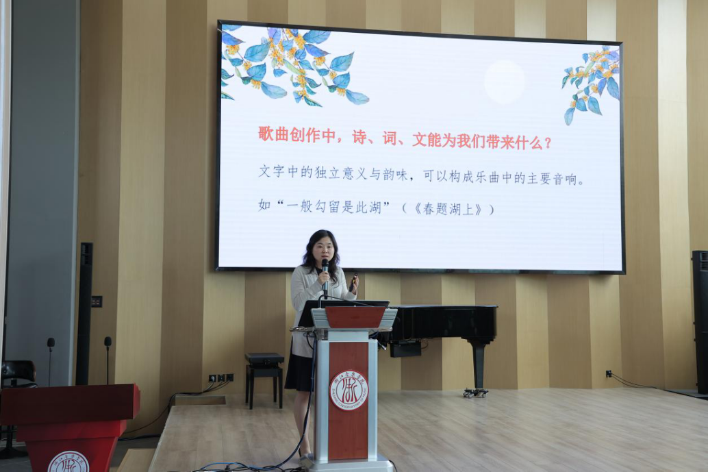 张泽艺用《红楼梦》原声主题音乐引出音乐创作中诗与乐的思考。她讲解了原创艺术歌曲《春题湖上》的创作思路和技法,强调用具有时代性的音乐语言传播古典诗词和现代诗歌,是当代作曲家的使命。