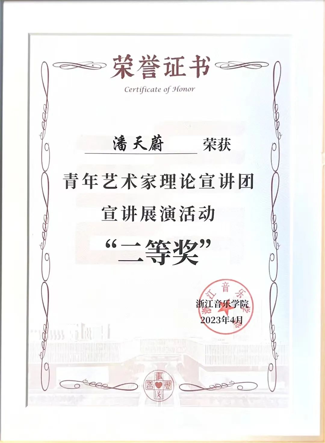 流行音乐系潘天蔚同学获学校青年艺术家理论宣讲团宣讲二等奖近期,浙江音乐学院青年艺术家理论宣讲团宣讲展演举办。19位宣讲团成员立足专业特长、各展其能,将自己的艺术才华化为宣讲中的一抹亮色,把深刻的理论宣讲“唱”给你听。在此次展演中我系流行211潘天蔚同学荣获二等奖。 本次展演是浙音青年艺术家理论宣讲团自去年底成立后的首次集中展示。活动以“贯彻二十大 奋进新征程”为主题,围绕“创新”“改革”“开放”等关键词,重点宣讲党的二十大精神和习近平新时代中国特色社会主义思想,“四史”及音乐党史,省第十五次党代会精神,以及浙音发展故事、浙音人“弘毅尚德、博约精艺”价值理念等内容,共有各二级党组织推选的19名宣讲团成员参加。  获奖感言 这次从准备宣讲到展演的经历对于我来说是十分深刻的。直到赛前周书记还在帮忙修改稿子,帮助我寻找状态调整语气语速等等;在整个宣讲的过程当中我十分享受同时也收获了领导老师同学们的鼓励和建议。 就着这股热乎劲儿,我又参加了第二次宣讲,代表学校参加了省思政微课大赛,稿子一遍遍打磨,还有我的战友L214班的陈芊宇同学很细致耐心地帮我制作PPT修改PPT。在系部领导老师同学的支持鼓励帮助下,在学校团委领导老师学姐们的帮助引领下,我蓄势待发,信心十足。  她说, 在浙音,于我而言,直行是音乐,左转是诗意,右转是生活,向后转是体育,每天都有滋有味。别裁伪体亲风雅,转益多师是汝师,对我们音乐生也同样适用。我想,音乐不仅仅是单纯的音乐,必须学好每一门学科,拥有强大的内心和健康的体魄,提升综合素质才能给音乐加分。在这个最美校园里,人与自然的完美和谐,总会与美好不期而遇。感恩浙音,不负浙音,不负青春,好好生活,好好学习,天天向上。 音乐的光就是五角星的星光,让我们成正气造就音乐之清气、清气之蔚然。“浙音人”是一种光环,更是一种责任,浙音已是无数学子实现音乐梦想的摇篮、是修身养性的智慧学堂、是人与自然完美融合的共同家园,作为一名普通浙音人,我会带着学校的期待与嘱托,带着系部的鼓励和帮助,以更自信更从容的步伐,讲好身边好故事,唱响中国好声音。
