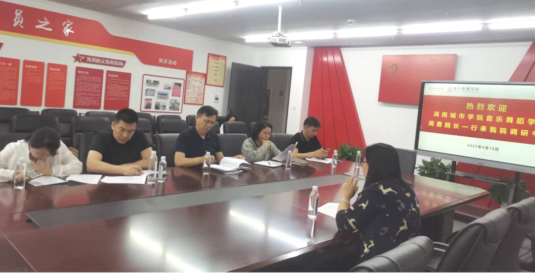 湖南城市学院音乐与舞蹈学院前来我校调研交流近日,湖南城市学院音乐与舞蹈学院院长周勇一行前来我校开展调研交流活动。我校音乐教育学院党政领导班子热情接待,陪同参观了学院楼宇场所和硬件设施,并组织开展了座谈会。  座谈会伊始,音乐教育学院党总支书记杨阳首先向来访的各位领导老师们表示热烈欢迎,并就我院师资队伍、育人模式、党建工作等基本情况做了详细介绍。副院长查大林和章艺悦就专业课程设置、学生培养方案、科研竞赛、本科教学、场馆设施、实习实践基地等方面进行了重点讲述。 湖南城市学院音乐与舞蹈学院调研团队对我院的热情接待表示感谢,对我院的教育教学工作给予高度认同,并就学科建设与专业改革、人才培养与实践教学、毕业设计等方面进行交流互鉴。 座谈会的最后,双方院校一致认为,在深入开展学习贯彻习近平新时代中国特色社会主义思想主题教育背景下的调研交流,对推动双方学院深化合作交流、实现院校教育高质量发展具有重要意义,期待彼此进一步交流联系,开展更为密切的交流合作。