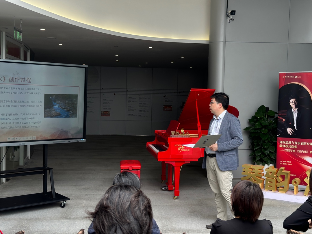 2023年5月30日,钢琴系“琴韵沐心”党建活动在学校党群服务中心举行。本场活动由钢琴系丁阳副教授主讲,大三学生王心宇、张馨日同学演奏。钢琴系党总支书记崔洁、教师党支部书记徐洁等教师党员和学生们等近50人参加了本次活动。本次活动是课程思政与音乐表演专业建设的融合模式探索——以钢琴系《室内乐》教学为例省级思政课题项目的重要组成部分,丁阳老师以作品《小河淌水》为切入点,从作品创作背景,作曲家再到演奏技巧一一为大家解读。