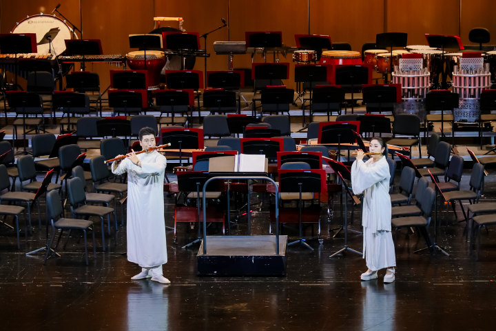 序曲——竹笛二重奏《远舟》,以别具匠心的设计启程。竹笛演奏家魏思骏与韩慧慧藏身于观众席中,悄然吹奏起曼妙的笛音,打破了传统音乐会演出的惯常形式,由此将听众带入到悠远神秘的时空中,以回望古老的文明,为整场音乐会奠定了厚重的文化质感,开启了如诗如画的音乐篇章。