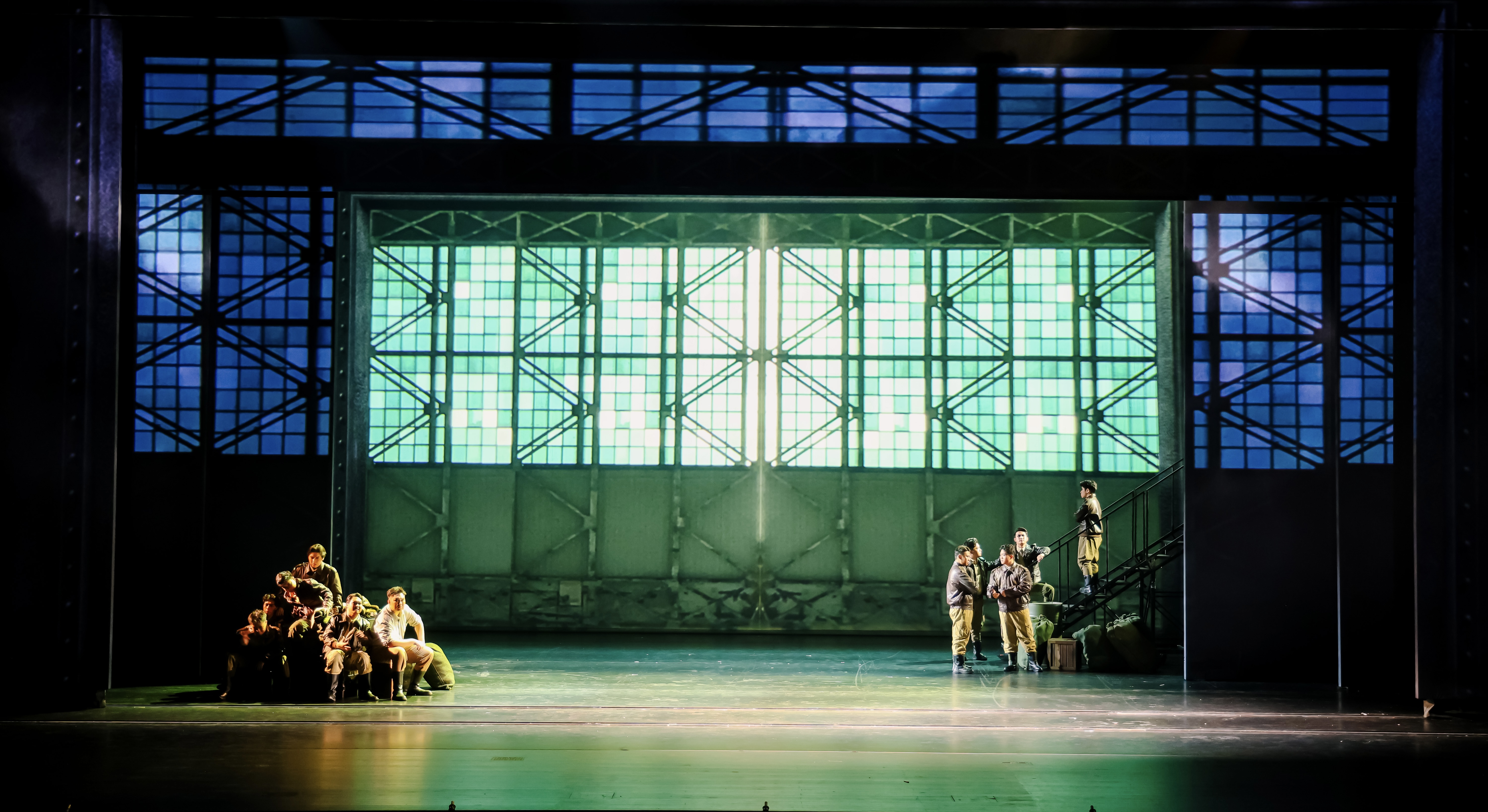 “本剧情景多、变化频繁、多时空并列,迁换需要快速高效。”丁丁介绍,为此,他在舞台三分之一深处,设置了一组可以开合的“云”景片,在深度上分割舞台空间,功能上则保证前区演出时后区换景的遮挡需要,“云开云合”完成瞬间的空间重组、传递信息和情感,增强艺术感和观赏性。加之现场以冷峻的钢铁结构象征战争的残酷与男性的阳刚,配合多媒体技术营造空战的激烈效果,最终呈现极具冲击力的视觉画面。