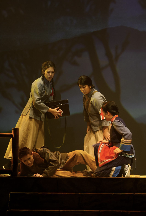在艺术呈现上,作品巧妙运用1944年与2025年双时空交织的叙事结构,将畲族文化传统、抗战历史记忆、英士大学办学史与浙南山乡独特风貌融入叙事。值得一提的是,作品深度融合畲族文化元素。剧中蓝翠翠的唱腔保留了畲族山歌特有的颤音节奏,村民的集体舞蹈严格复刻了畲族“踏步摆腰”的传统动作,舞台上的每个画面都在诉说着浓浓的民族风情。
