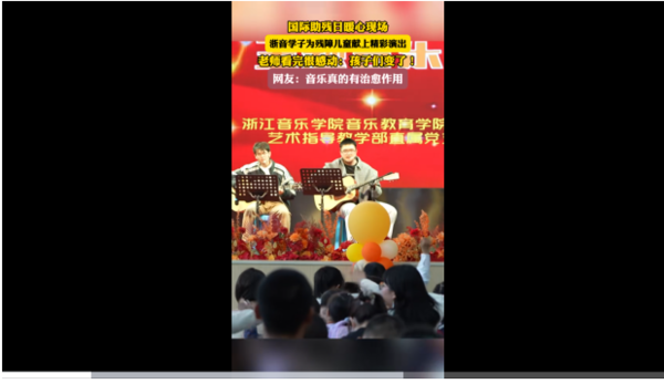 浙江新闻频道:国际助残日暖心现场,浙音学子为残障儿童献上精彩演出,老师看完很感动:孩子们变了! 网友:音乐真的有治愈作用。