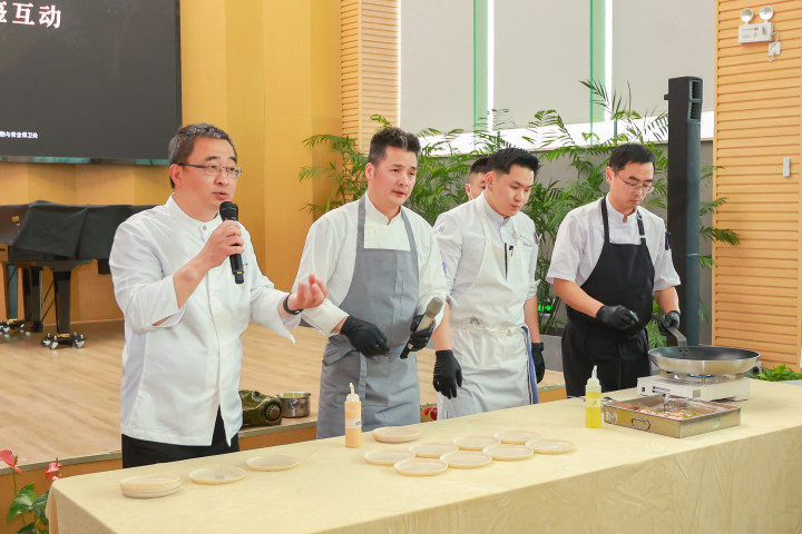傅月良大师现场制作餐厅招牌菜——第50多版的龙井虾仁和百花酿虾胶,还分享了坚持传承创新杭帮菜的的心路历程,讲解菜肴背后的文化故事。