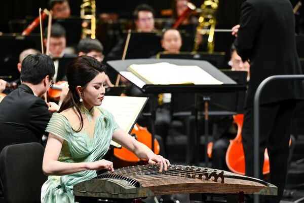 音乐会以一曲激昂的《鲁斯兰与柳德米拉》序曲激昂开篇。随后,古筝协奏《望云赋》以清透灵动的音韵勾勒出云卷云舒的东方意境,而歌剧选段《爱永在》则以深情的旋律吟咏出真挚隽永的家国情怀。琵琶协奏《丝路飞天》以繁复的指法与丰富的音色变化,再现丝绸之路上的风物与遐思。《鸟儿在风中歌唱》以极具艺术感染力的演绎,将深切而克制的悲情浸透于每个音符之中,直抵人心;《苗岭飞歌》则一转情绪,以清亮悠扬的嗓音唤醒山野间蓬勃的生命气息,宛如晨光穿透层林。钢琴与乐团奏响《保卫黄河》,铿锵有力的琴声如浪潮奔涌,澎湃的激情与厚重的民族气魄震撼人心。普罗科菲耶夫《第三钢琴协奏曲》以现代性的节奏张力与抒情段落交织呈现,展现出技巧与音乐的深度交融。歌剧《塞维利亚的理发师》选段《快给大忙人让路》则以诙谐生动的舞台表现与敏捷华丽的演唱,挥洒出鲜活的戏剧光彩。特别呈现的二重唱《恐吓吧,激烈的言辞》(选自歌剧《命运之力》),由两届“金钟冠军”联袂演绎,歌声中激荡着命运的对抗与交织,张力迭起,将全场情绪推向高潮。